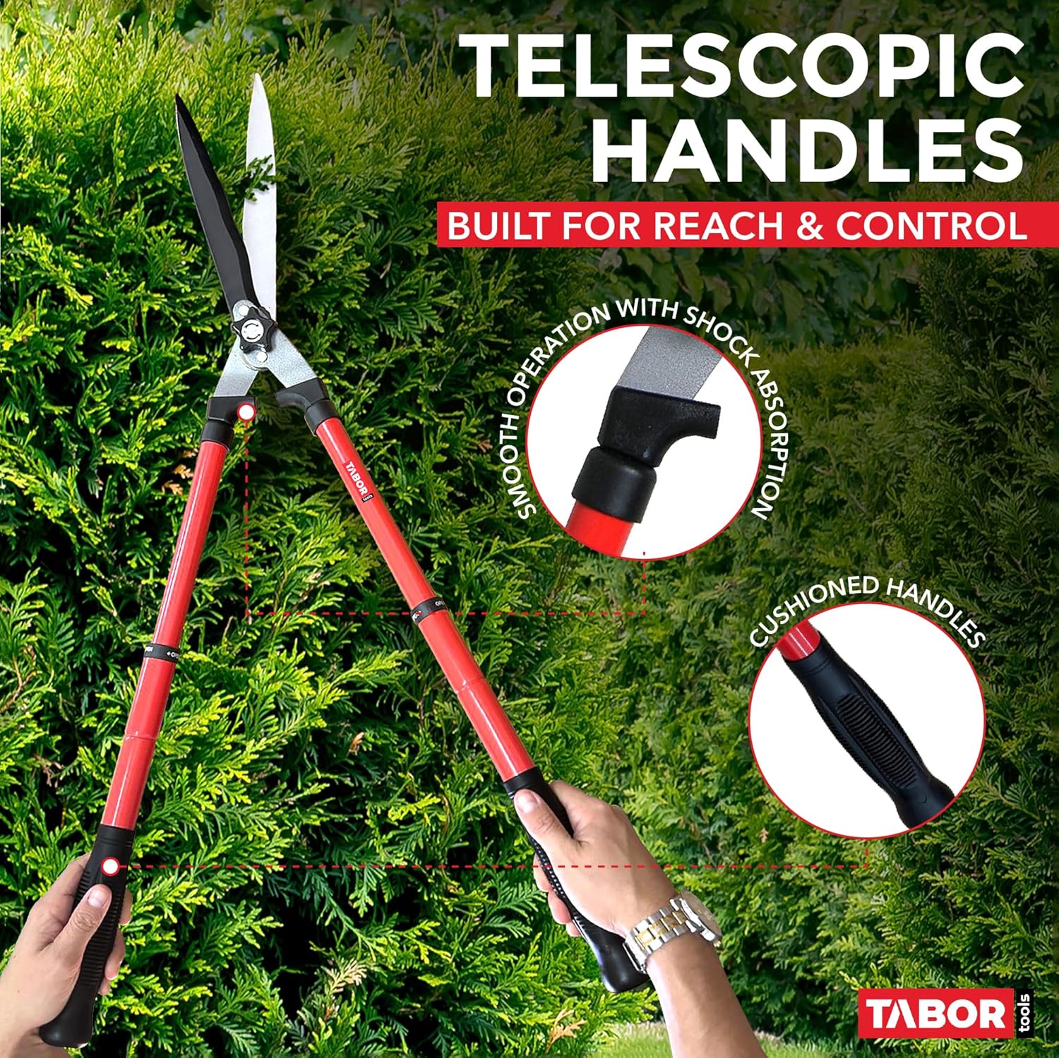 TABOR TOOLS B212A Telescopic Hedge Shears with Wavy Blade and Extendable Steel Handles. Extendable Manual Hedge Clippers for Trimming Borders, Boxwood, and Tall Bushes.