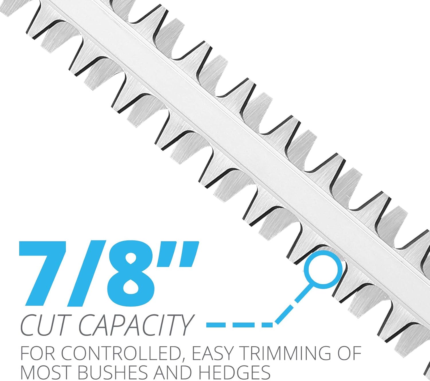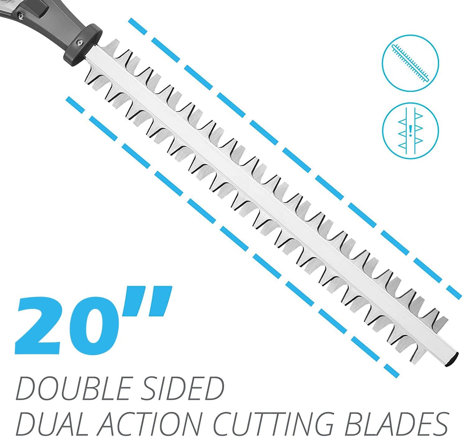 - Double Sided Dual Action Cutting Blades: Swift pole hedge trimmers with double-sided dual-action cutting blades cut both vertically and horizontally up to 0.9Inches; The cutting teeth are droplet shaped with a large tooth spacing and integrated cut protection to ensure high cutting performance.