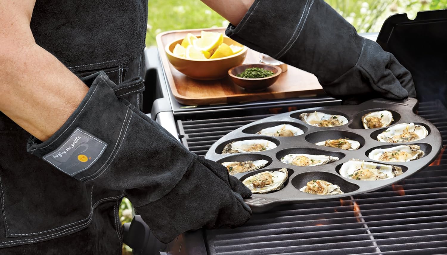 - Protects hands and wrists from the heat, flames and sparks when grilling