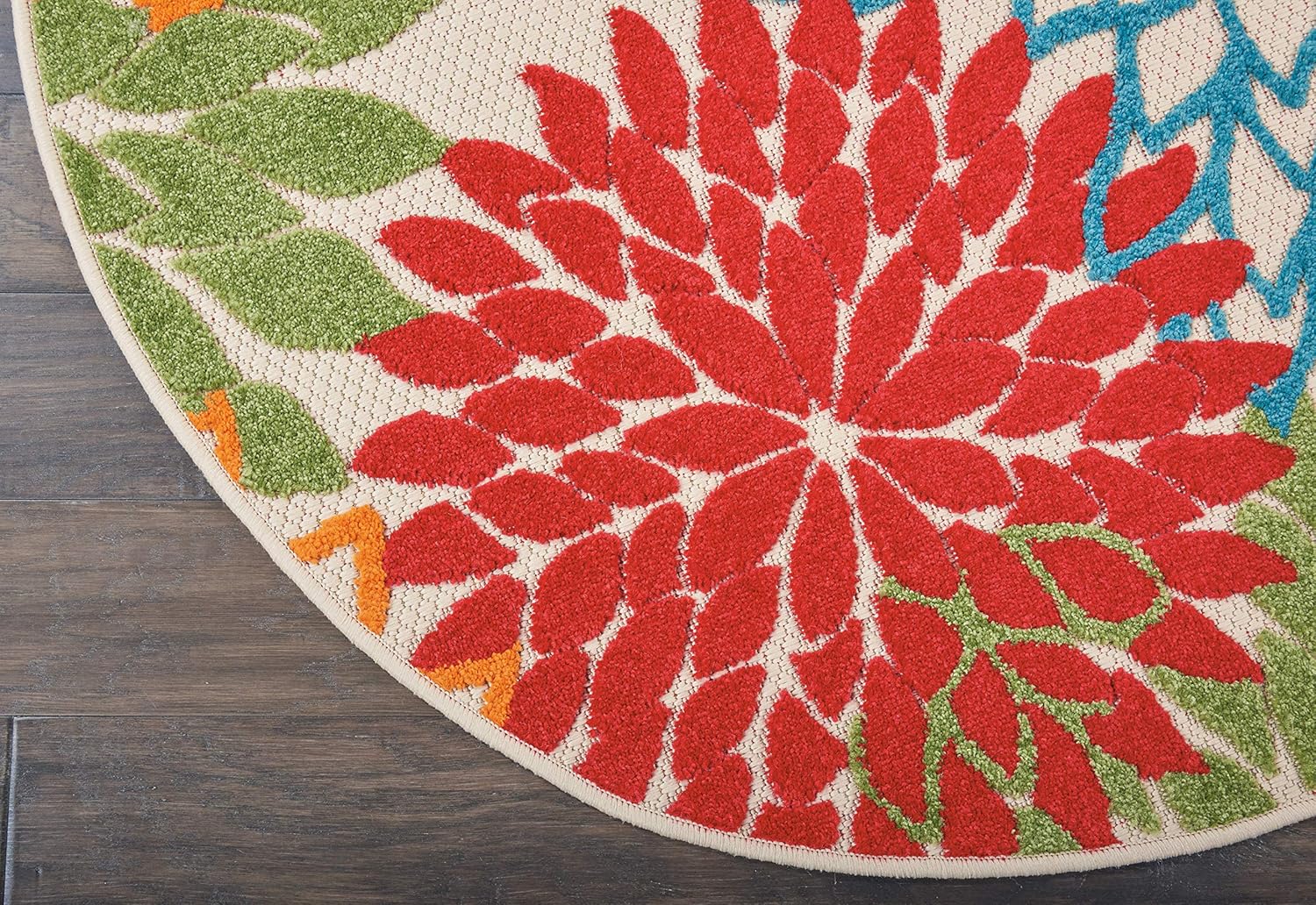 - Floral indoor/outdoor rug brings a cool tropical vibe to your home