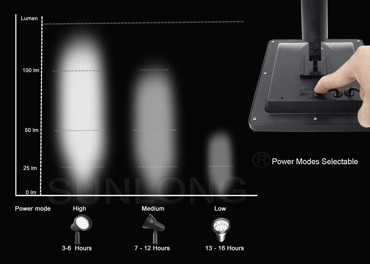 - Solar Lights Outdoor Spot lights . Flag Light 2 x 15 Leds Solar Powered. 8-10 Hrs Lighting at Nighttime Automatically Without Any Electric Expense After 6-8 Hrs Charged in The Sun . Output Brightness 3-Grades Adjustable Power Switch to Match Different Weather Conditons.IP65