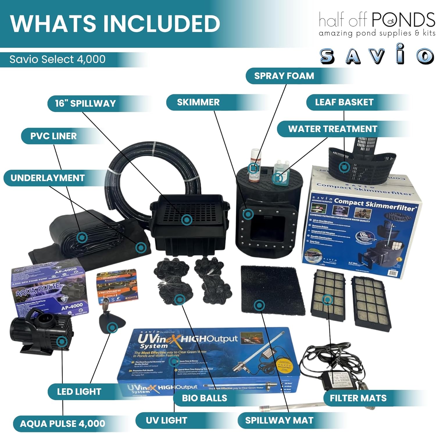 HALF OFF PONDS Savio Select 4,000 GPH Submersible Pump Pond Kit with 15' x 25' PVC Plastic Pond Liner, UV Clarifier for Water Garden & Koi Pond