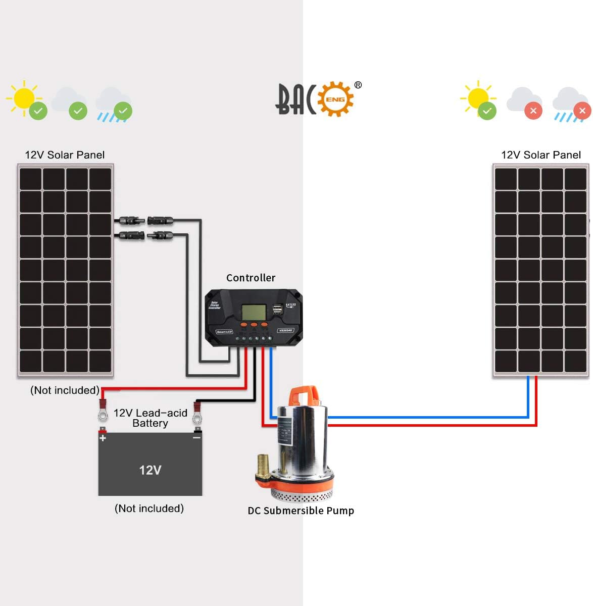 BACOENG 12V DC Farm & Ranch Solar Water Pump Submersible Well Pump 20FT Lift