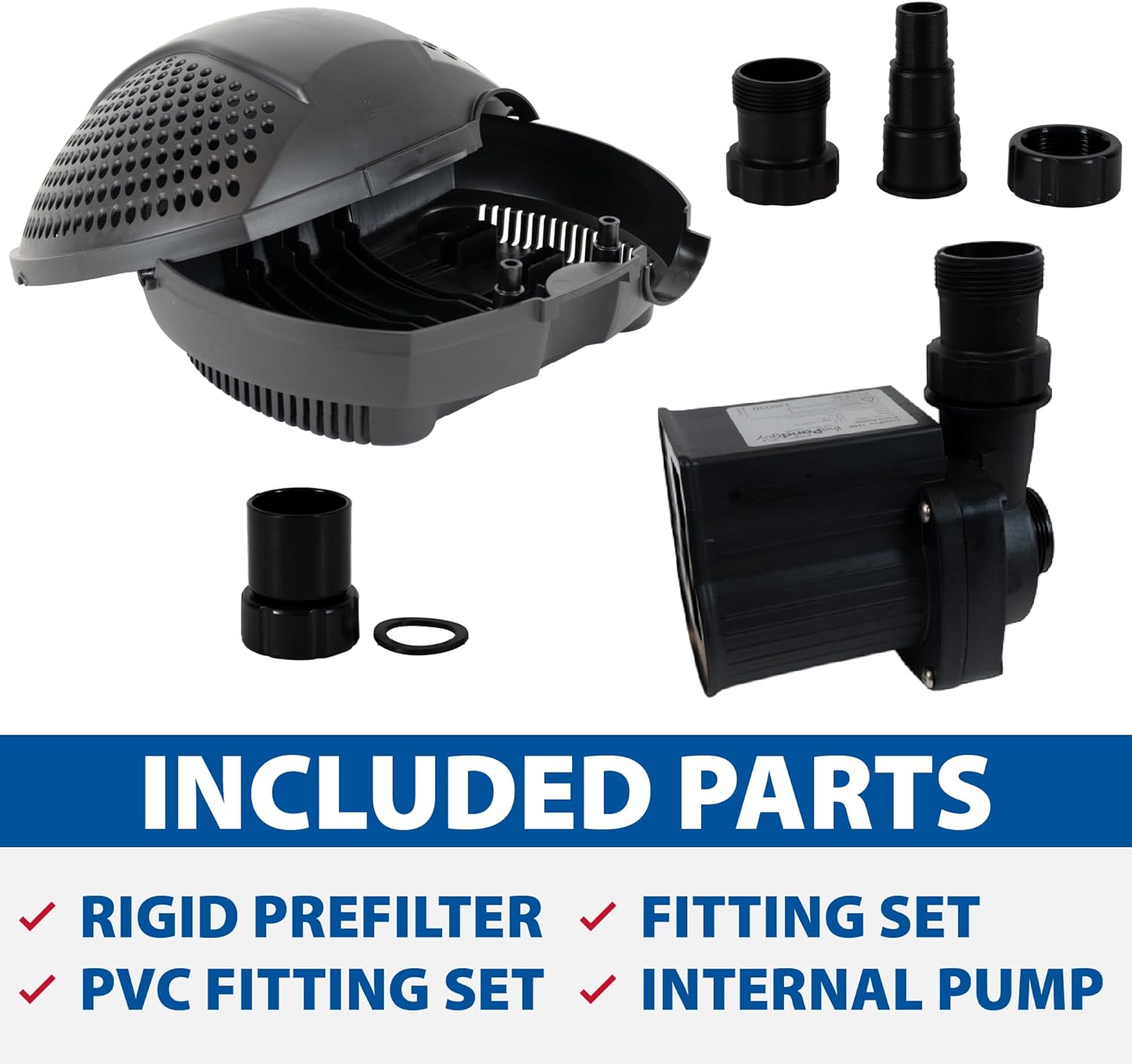 - Pre-Filter Keeps Large Debris Out -- The sturdy pre-filter pump enclosure is designed to keep out large debris while allowing particles up to 1/4" to pass through. Ideal for ponds without a skimmer.