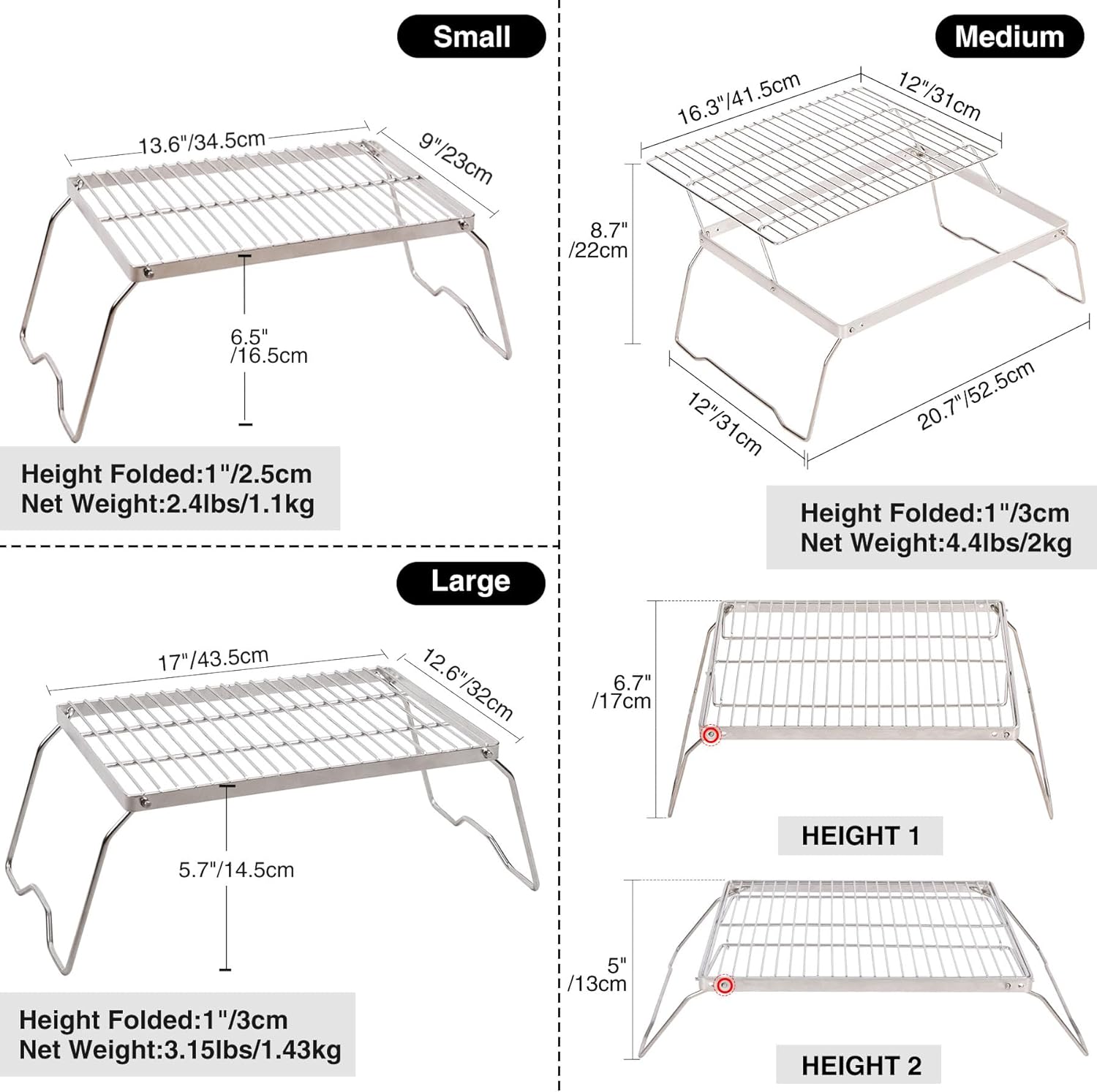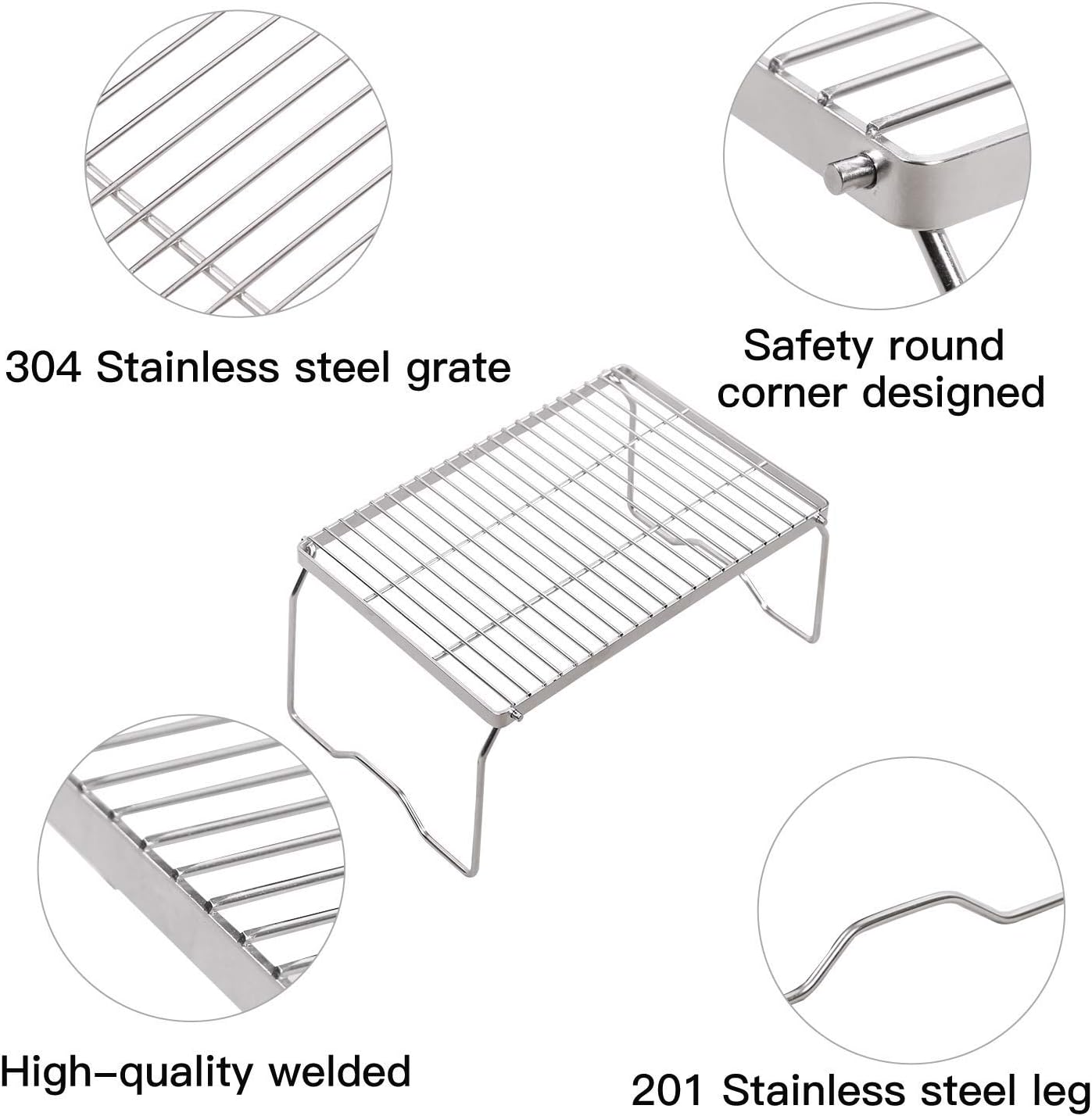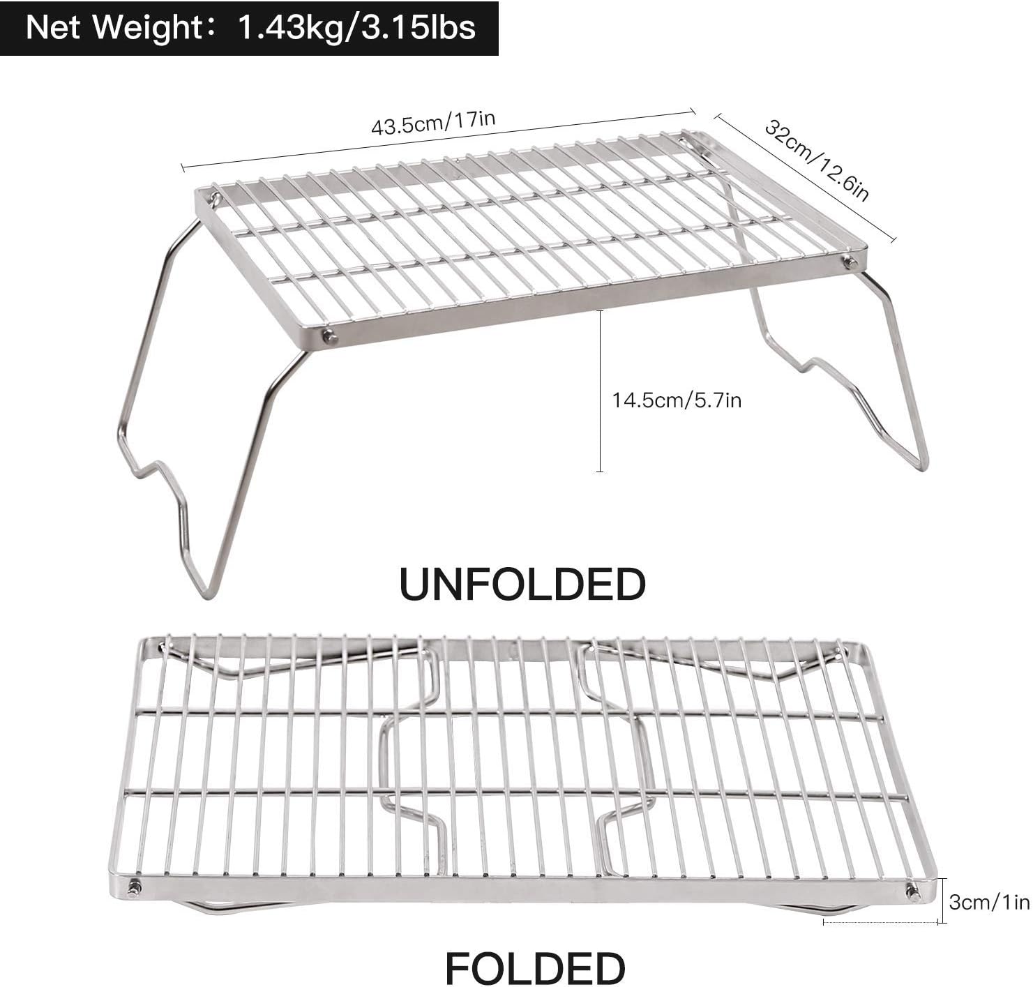 - HIGH QUALITY MATERIAL: The over-the-fire camping grill is made of 304 stainless steel grate and the legs are made of 201 stainless steel. This helps the grill resist oxidation and corrosion. Stainless steel also makes it lighter and more durable than iron.