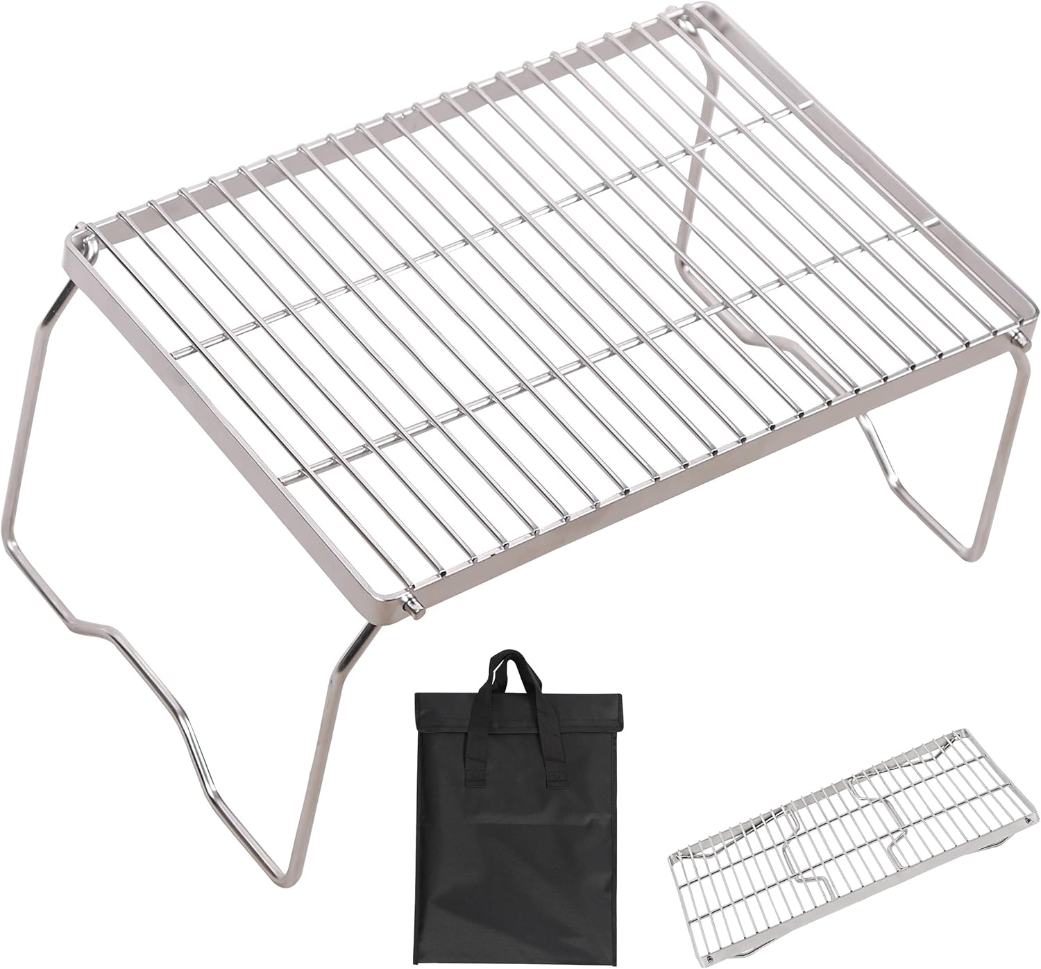 - HEAVY DUTY & PORTABLE: Legs angle out for stability and help to take the weight. Legs can also be folded up for easy transport and compact storage. The outdoor Stainless Steel folding campfire grill with carrying Bag is essential gear for camping, backpacking, backcountry treks and more.