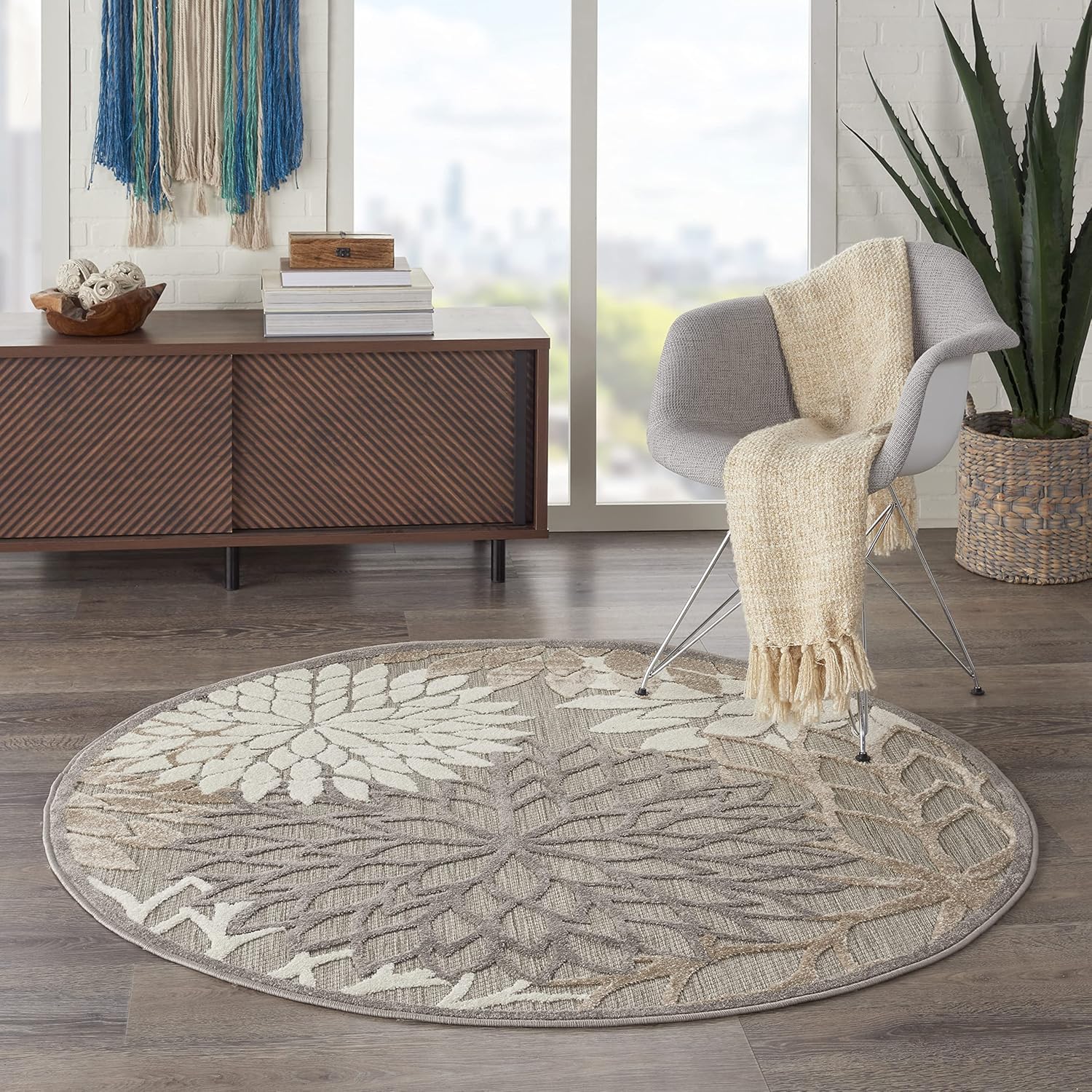 Nourison Aloha Indoor/Outdoor Area Rug 5'3", Natural, Round Tropical Botanical Easy-Cleaning Non Shedding Bed Room Living Room Dining Room Deck Backyard Patio