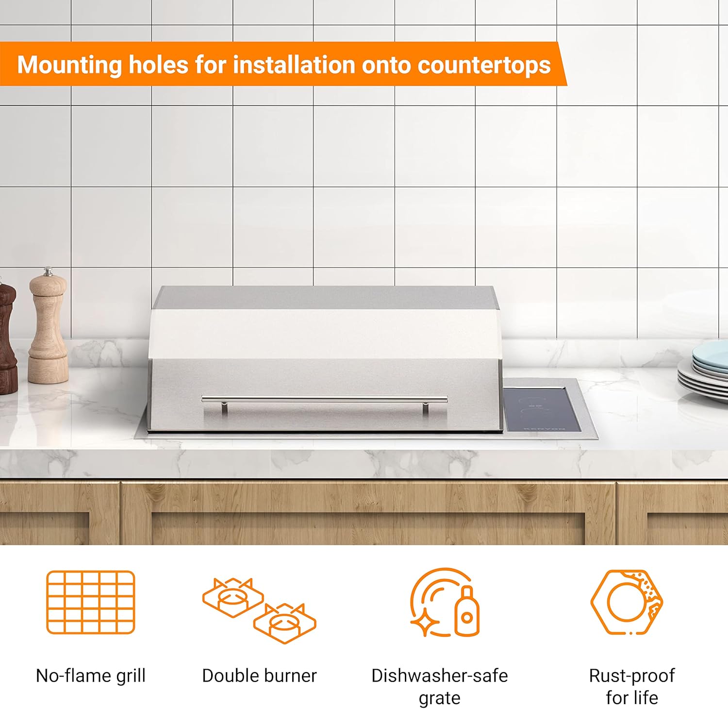 - Stainless Steel: High-quality marine-grade 304 stainless steel makes the grill weather resistant and rust-proof for life. The outdoor and indoor grill with faceted single-piece lid and 240V hardwire connection provides smokeless and no-flame grilling.
