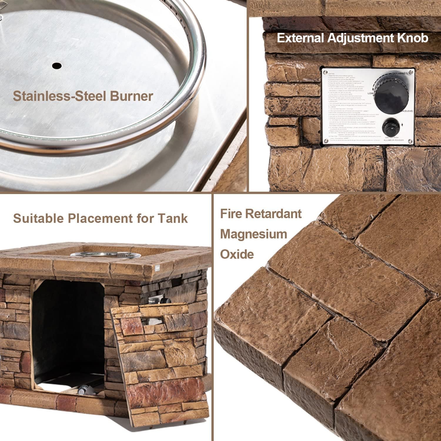 - š„ć Stylish Patio Fun ć: This set has a natural outdoorsy look with our " mottlewood brown" all-weather synthetic PE resin wicker handwoven around a sturdy rust-resistant powder-coated steel frame. A single armchair for that one guest who's afraid of cooties. The faux brown ledgestone square base fire table made by fire retardant magnesium oxide with a stainless steel burner bowl. Clean burning propane flame provides soothing warmth and a centerpiece for many outdoor evenings worth remembering.