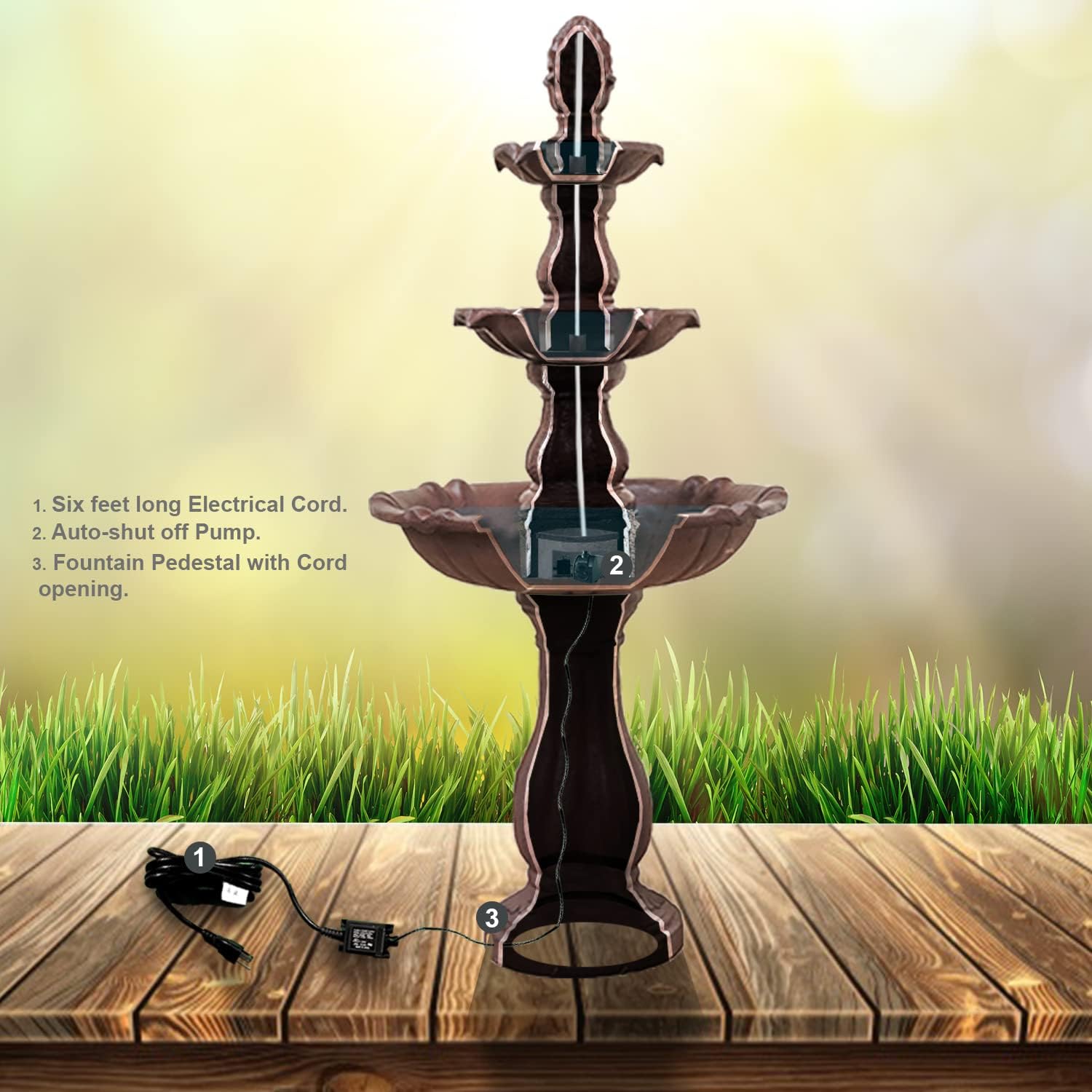 - 3 TIER OUTDOOR WATERFALL FOUNTAIN: Decorate your garden, patio, porch, deck or any outdoor space with this glamorous 3 tier freestanding brown waterfall fountain and create an inviting ambiance where everyone enjoys