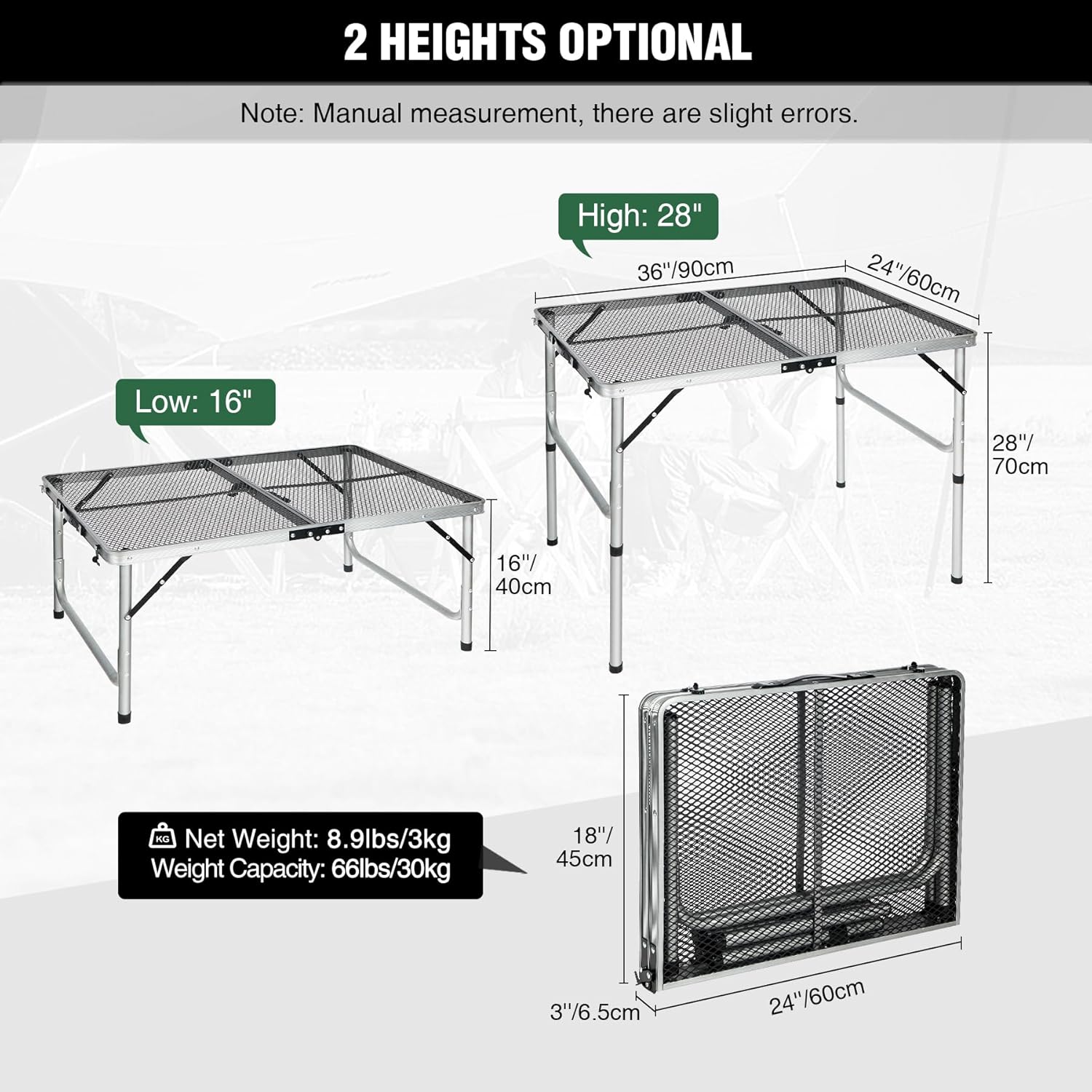 - Compact, Lightweight & Portable: The portable outdoor grill stand table weighs only 7.4lbs/3.3kg, weight capacity 66lbs/30kg; Quick to fold up and carry with the handle.