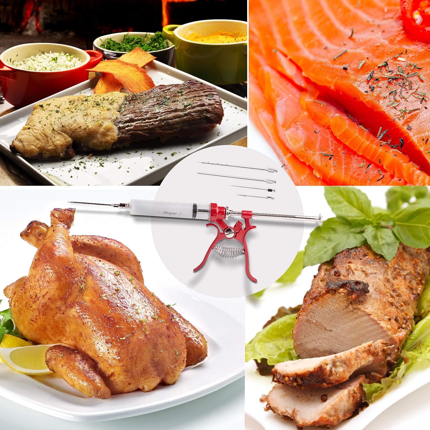 - š Metal Marinade Needles For All Needs : BBQ injector set includes four needles to cover all of your marinade meat injector needs, two designed for turkey, steaks and chicken fillets - for flavor injection into big pieces and two of infusing garlic and herbs - for injection into small pieces.