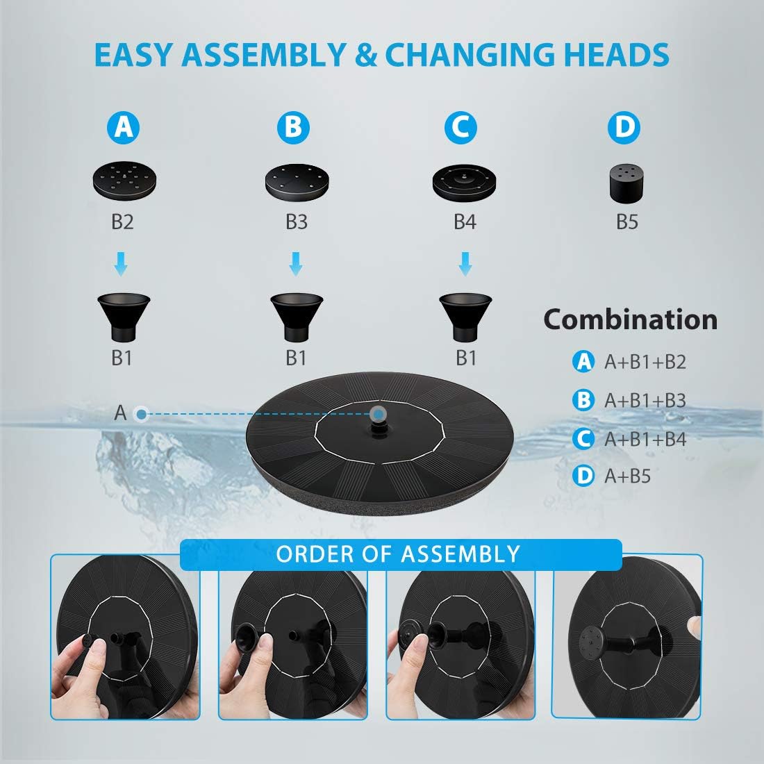 - MULTIPLE WATER PATTERNS - Multiple fountain heads for different water patterns; Easy assembly and exchanging of heads; Please kindly ensure sufficient water supply in smaller water features, especially on sunny days