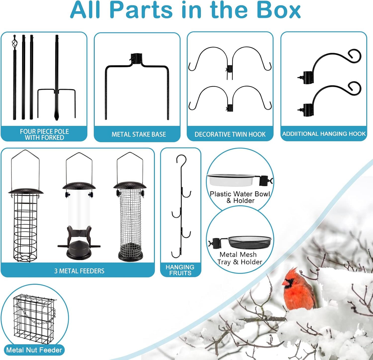 - Stable: The base of outdoor bird feeding stand pole has five prongs. When inserted into the ground, five prongs hold the ground firmly, and all the hooks have a deep curvature Therefore, the bird feeder kit is not easily blown over by the wind