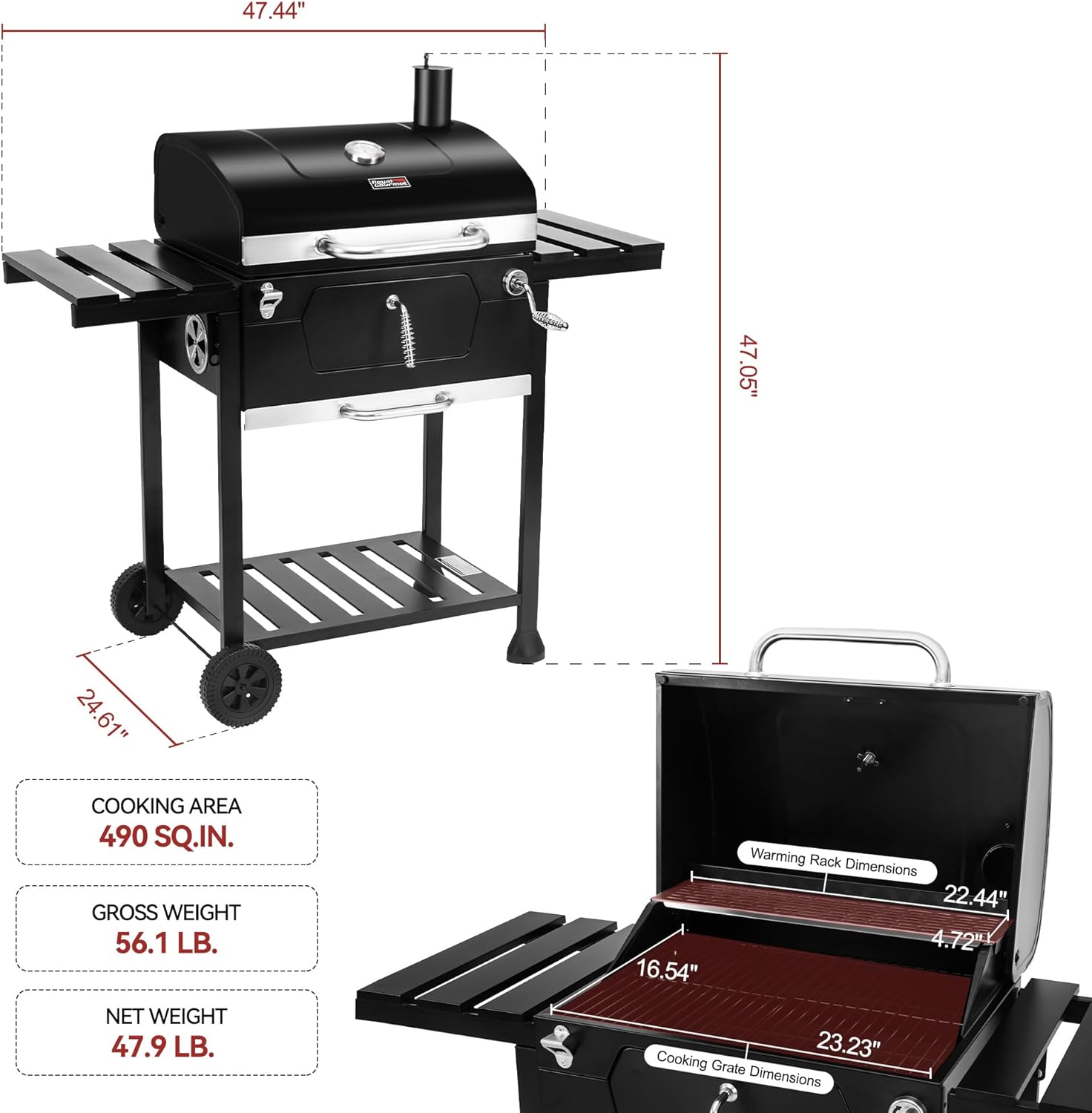 - Ample Cooking Space & Precise Monitoring: This charcoal grill offers a 490 sq. in. total cooking area, with 384 sq. in. porcelain-enameled grates and a 106 sq. in. warming rack, holding up to 22 burgers at once. A built-in thermometer on the lid of this charcoal bbq grill lets you monitor real-time temperatures for perfect grilling
