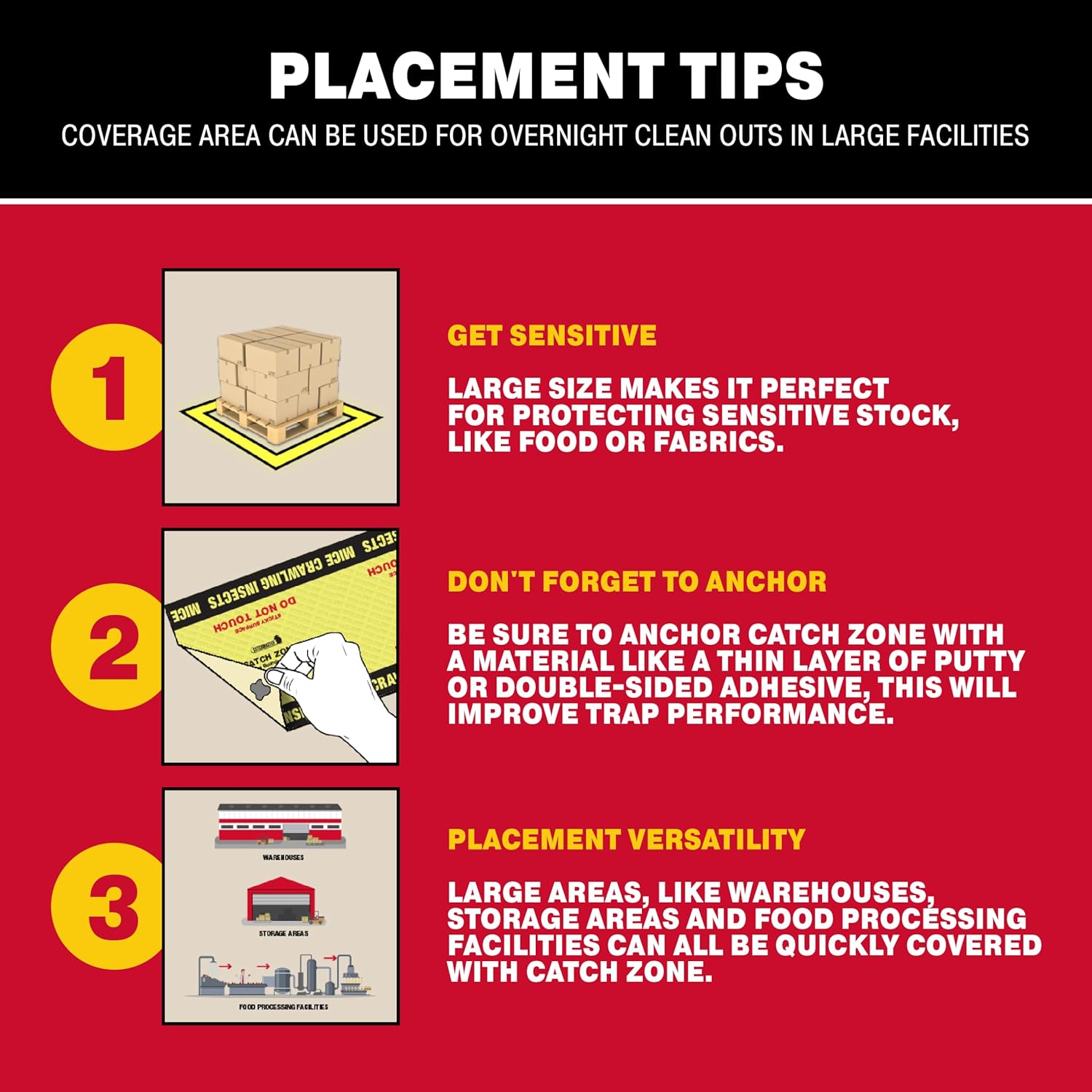 - READY TO USE: This outdoor and indoor bug killer is intuitive, secure and effective. Catch Zone Pests traps are easy to place and disposable, simply put the trap against walls & along pathways to catch unwanted pests and insects. Use duct tape, masking tape, labels or Catchmaster Hercules Putty to secure the sticky traps in place.