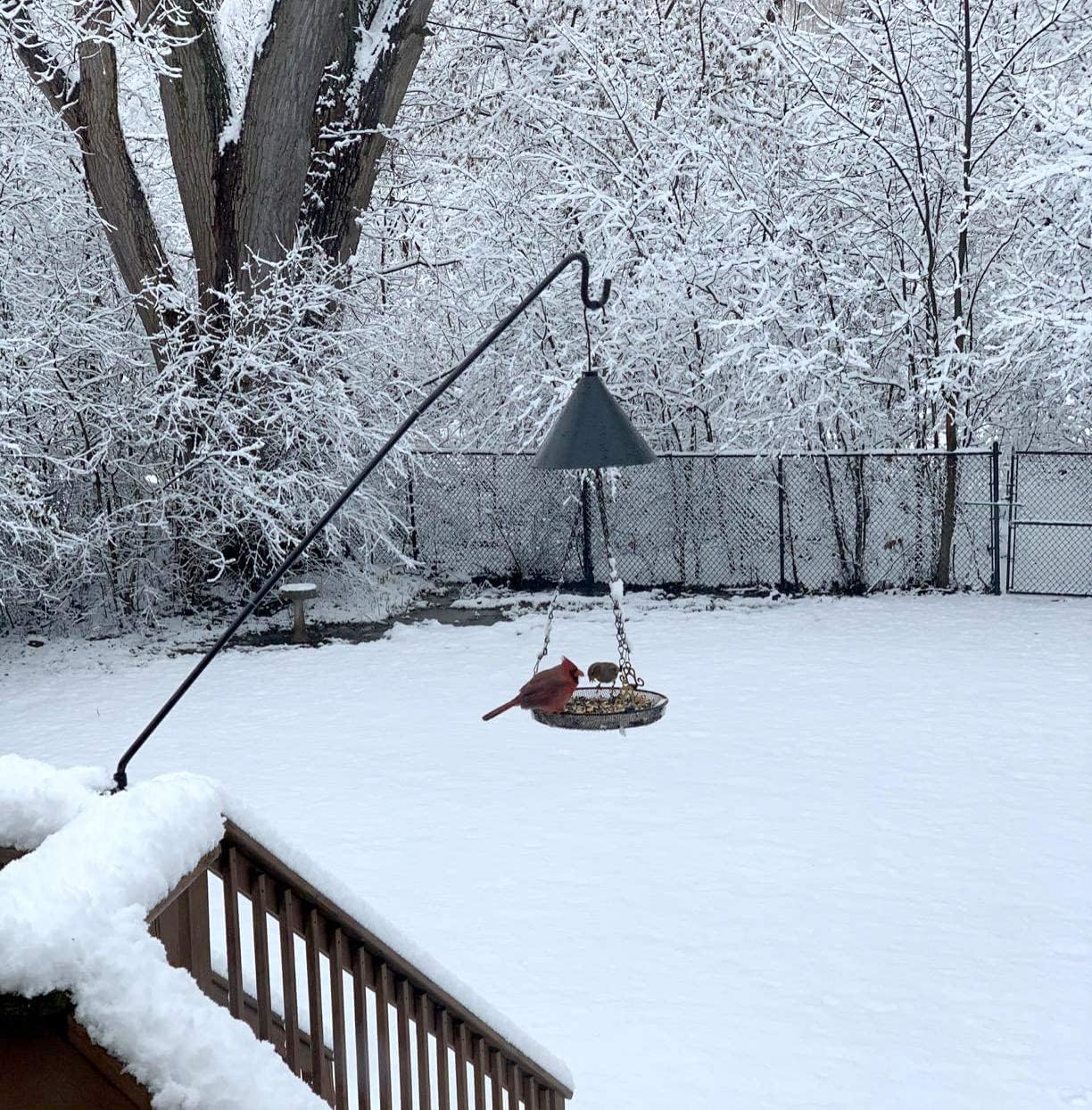 - Deck Hook Smart Design:43-inch bird feeder pole, a longer distance guard against squirrels. Things like bird droppings and seeds all fall off the deck, making it easier for you to clean up.