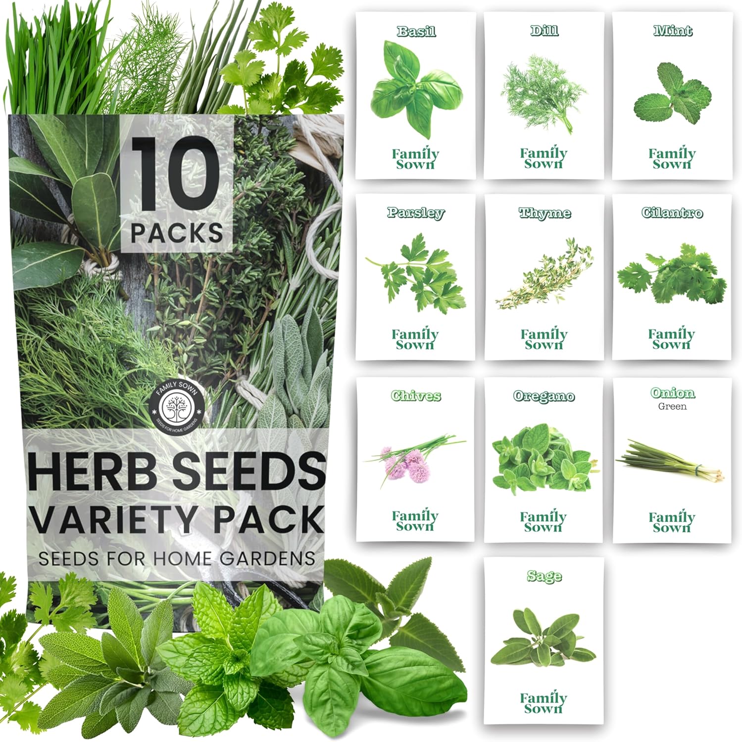 - 10 INDIVIDUAL SEED PACKETS: Basil Italian, Chives Common, Cilantro Slow Bolt, Dill Bouquet, Mint, Onion Evergreen White Bunching, Oregano, Parsley Plain Italian, Sage Broad Leaf, Thyme. Enjoy a diverse range of fresh, homegrown herbs for every recipe.