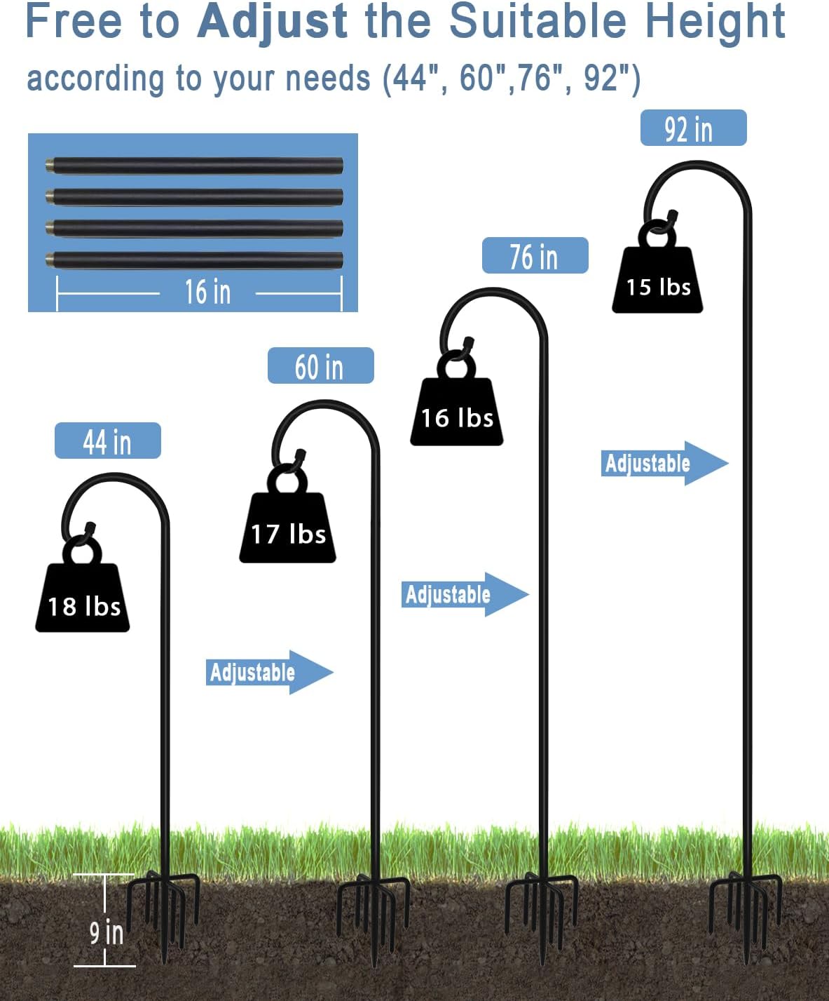 - Extendable & Tall Hook Hanger: The outside shepherd’s hook hanger made of 3/5 inch width & 2mm thickened steel pipe with 5 solid anchor points, you can free to adjust the suitable height for 92", 76", 60 " or 44 ", and also make it stands firmly in the ground without easily falling down, no fear of severe weather such as strong winds, heavy rains, and blizzards, (2 PACK / SET)