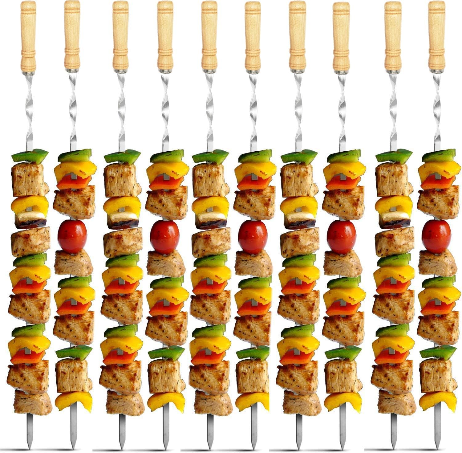 - PREMIUM STAINLESS STEEL, EXCELLENT PERFORMANCE-The kabob skewers are made of premium stainless steel which is food grade, rust proof and heat resistant. The heavy duty grill skewers are corrosion resistant and can last long. All edges around the metal skewers are well polished, making the barbecue skewers safe to use. Metal shish kabab skewer is of solid one-piece design. The bbq kabob sticks is thick enough, allowing you put more weight on each skewer without getting bent or twisted.