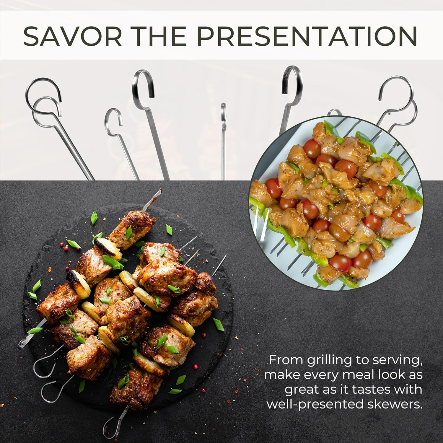 - HOOK HANDLE FOR EASY GRIP & SAFE-HANDLING: Designed for comfort and safety, the metal skewers feature hooked handles that provide a secure grip while keeping your hands away from the heat. They are designed for effortless use, ensuring a comfortable grilling experience every time.