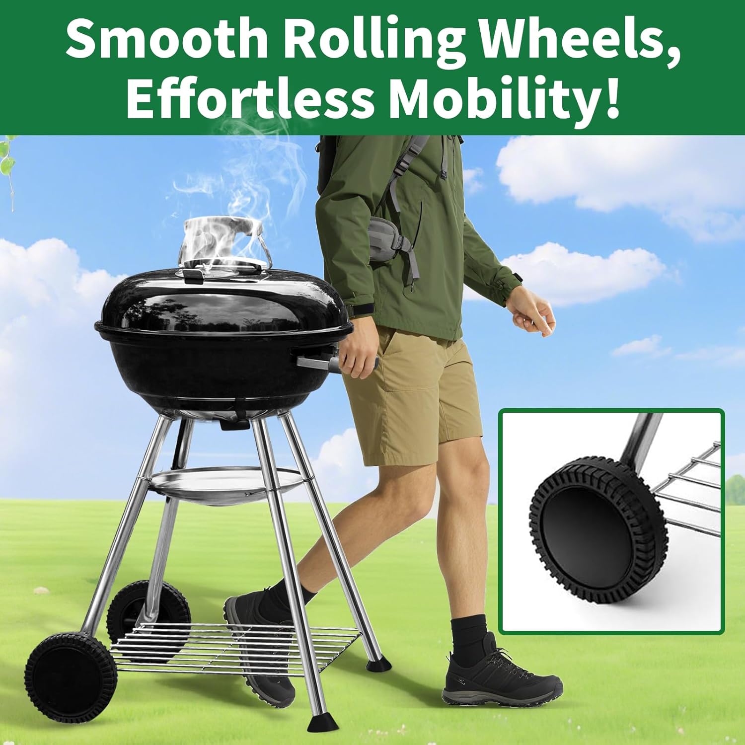 - Portable Charcoal Gril:Portable charcoal grills with dimension of 18 inch diameter by 31.5 inch high. Durable 18 inch diameter of BBQ grill plated steel cooking grate provides 255 square inches ample cooking surface for any meal of your grilling. A perfect Go-anywhere kettle grill with insulated handles and upgraded durable wheels for outdoor camping by getting your friends or family hovering around the grill, hungry for tempting charcoal flavor of burnt food.