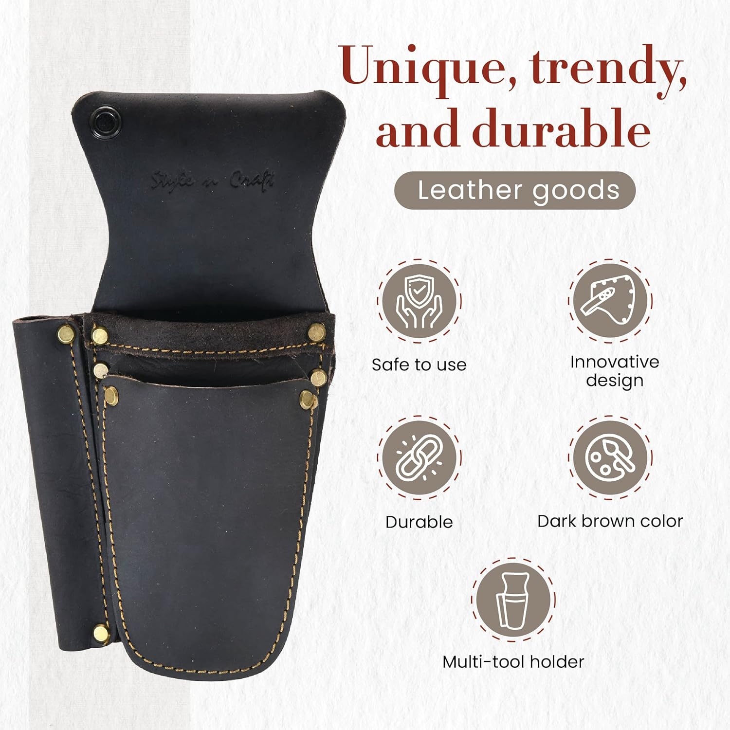 - Heavy top grain oiled leather in dark brown color.