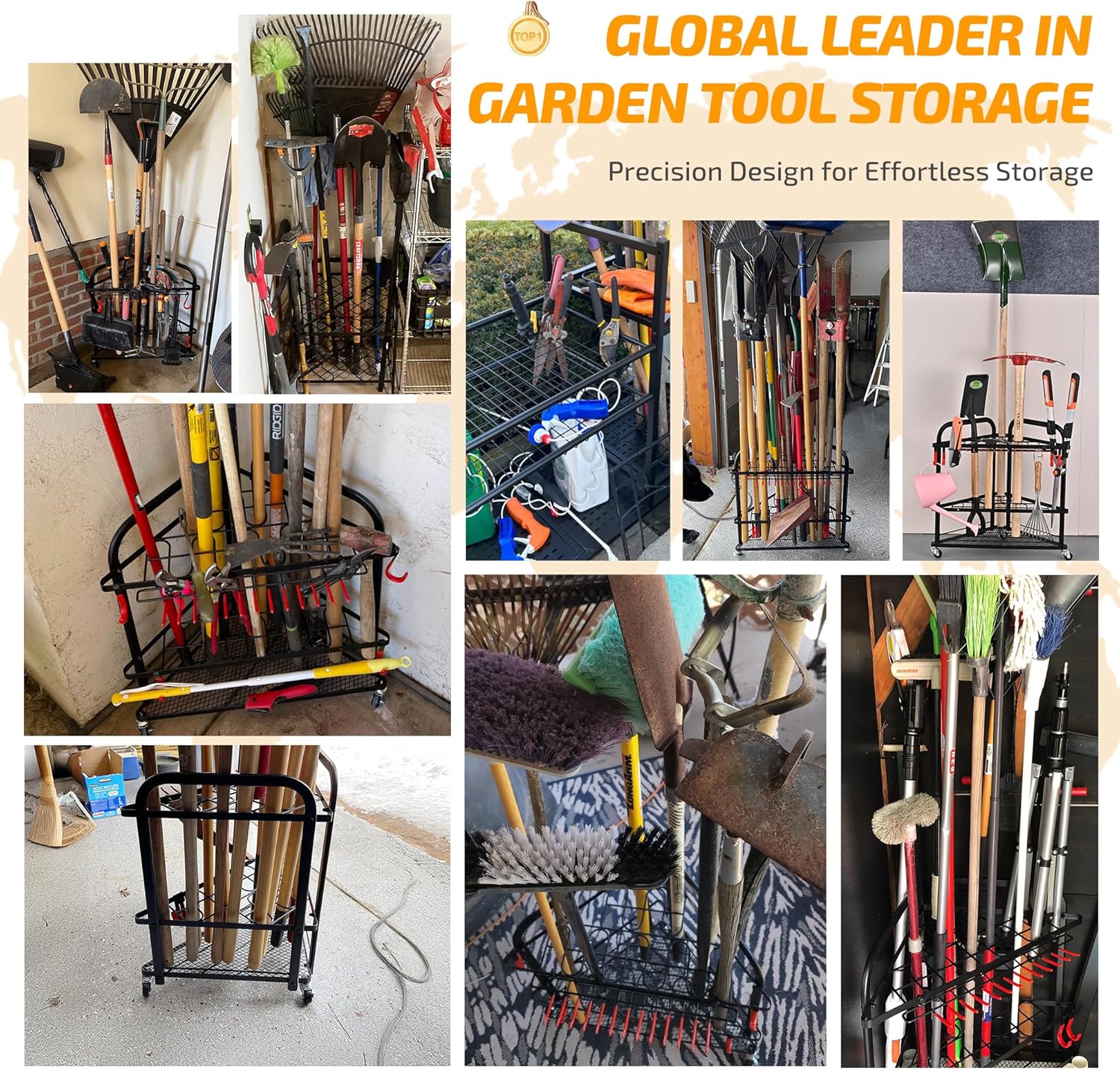 PLKOW Garden Tool Organizer with Wheels and Storage Hooks, Rolling Corner Tool Storage Rack for Garden, Shed, Garage, Powder Coated Steel, Black