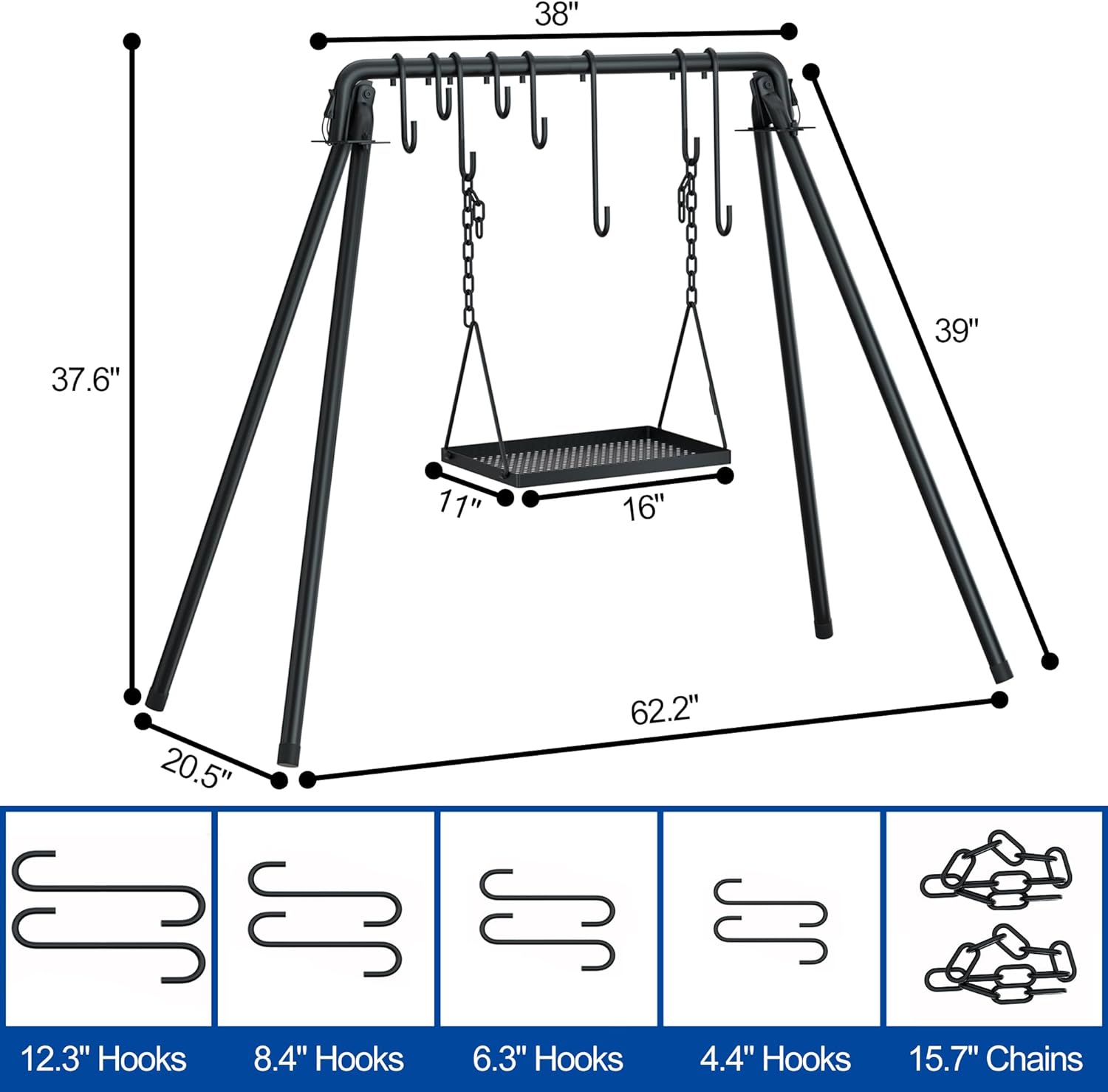 - Swing Tray & 8 Different Length Hooks:The BBQ swinging grill cooking set comes with a lagre 16"(L) x 11"(W) swing tray,you can adjust the distance between the swing tray and the fire source by 2 chains,so that you can control the temperature according to different food!Each grill set includes 8 hooks of 4 different sizes,with these multiple length hooks,you can adjust height to fit the fire,cook multiple food material at the same time,or hang barbecue tools,ingredients,kitchenware or other Items