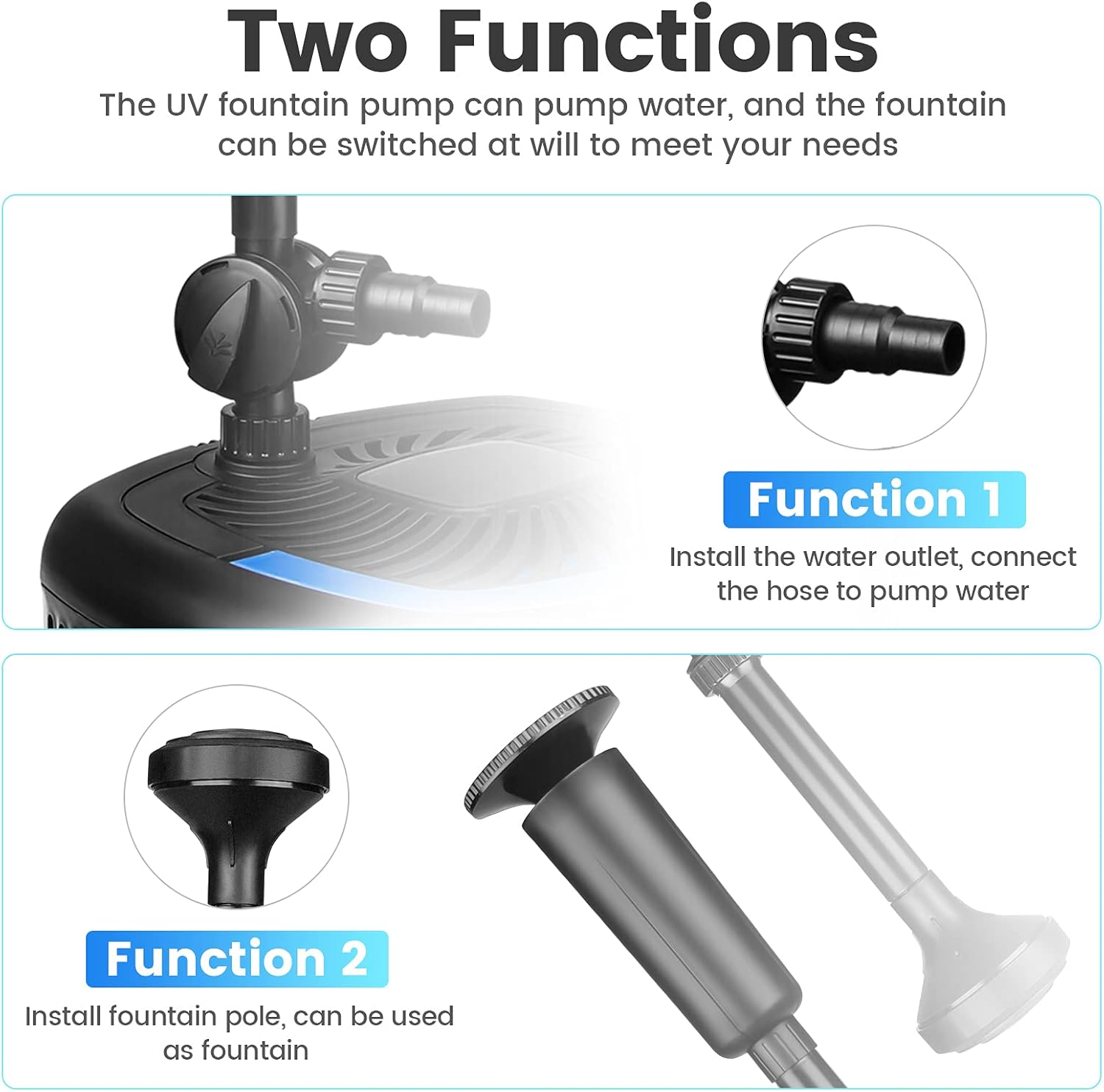 - 4 in 1 multifunctional system: 1. Filtration: The 37W pond pump can filter multiple times to purify the water quality. 2. Lamp: 13W work lamp effectively inhibit aquatic organisms and keep fish clean and healthy. 3. Pumping: The pumping flow can be adjusted to meet the daily pumping needs of the pond. 4. Fountain: Two fountain styles add charm to your pond.