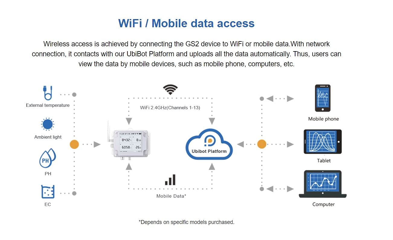 - Set-up in seconds via Ubibot App or PC Tools. Connect using 2.4GHz WiFi, mobile GPRS/3G/4G networking using a SIM card. (SIM card is not provided) no hub required (5GHz WiFi not supported) . Easy data access anywhere via the App or web console. Works with IFTTT, allowing you to build automated link with other smart devices.