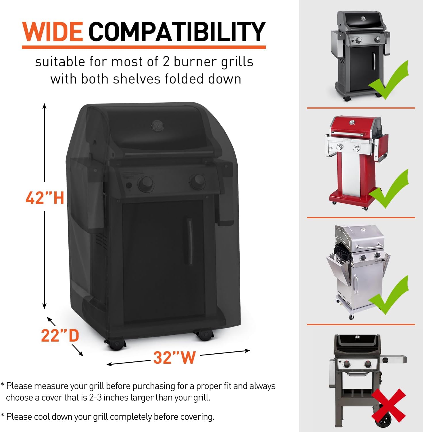 - Small Grill Cover - The 32” W x 22” D x 42” H Arcedo Two Burner BBQ Grill Cover fits most 2-burner gas grills with side shelves down, compatible with Weber Charbroil Nexgrill KitchenAid Monument and etc.; also fits 3 burner small grills for Kenmore with side shelves down up to 30'' wide. Does NOT fit Spirit E II-210 grills. Be sure to measure your grill before purchasing.