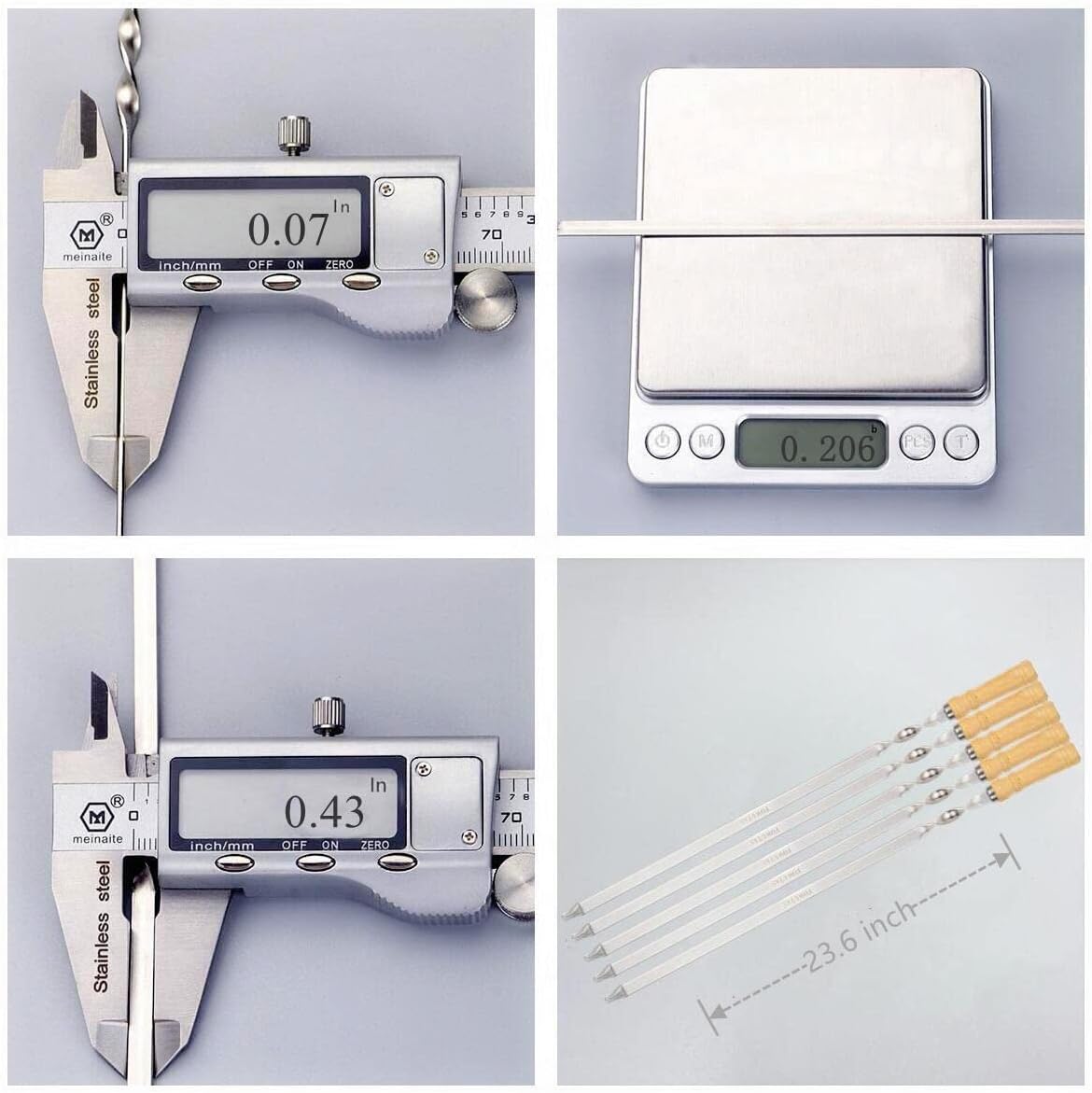 - LARGE KEBAB MEAT SKEWERS:The whole product length of our large BBQ kabob skewers is 23.6 inch. Product Details:The wooden handle portion is about 4 inch;the twist portion is about 3 inch;the food placing portion is about 16.6 inch.The barbecue skewers width is 0.4 inch ;The barbecue skewers thickness is 0.07 inch