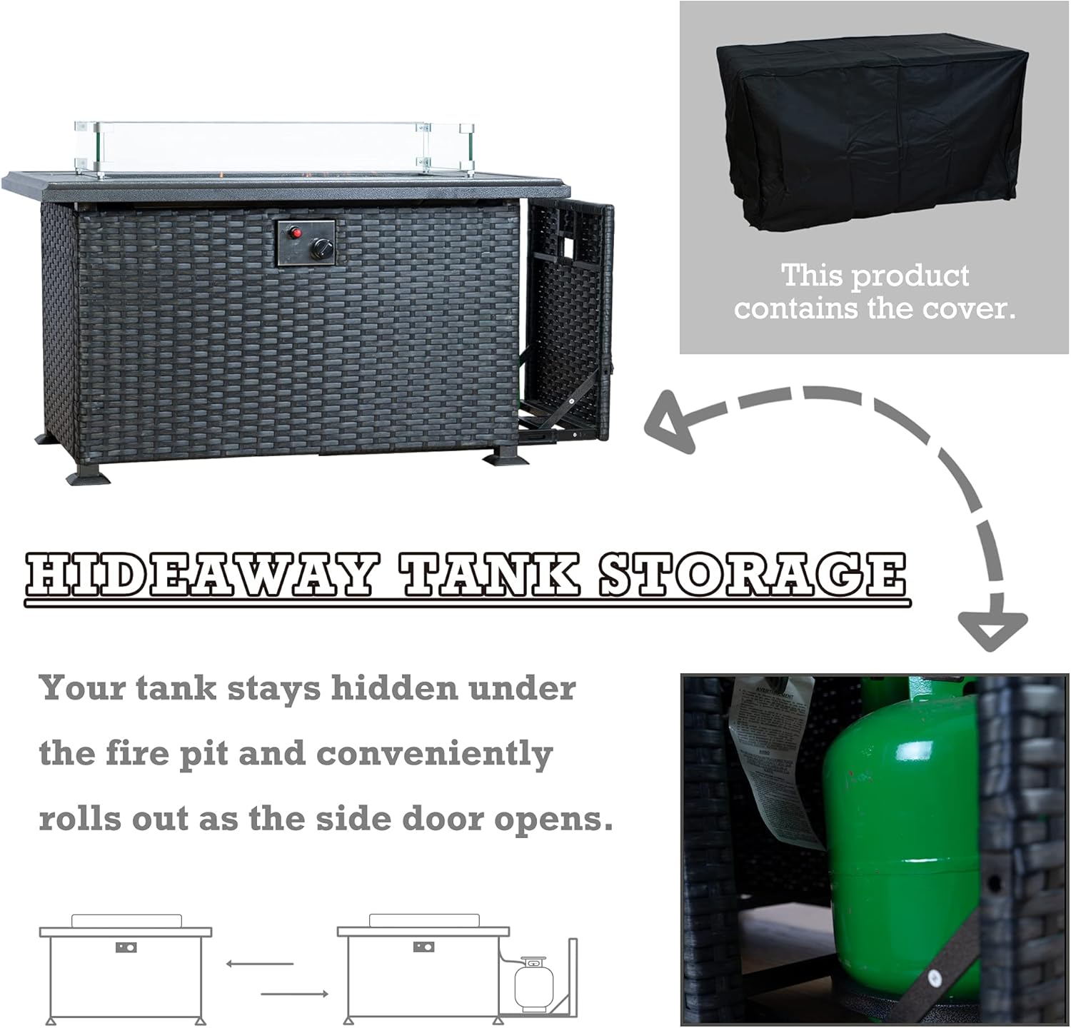 - โ Slide Out Tank Holder - The patio fire pit table has a slide-out tank holder, making it easy to change the propane tank when needed.