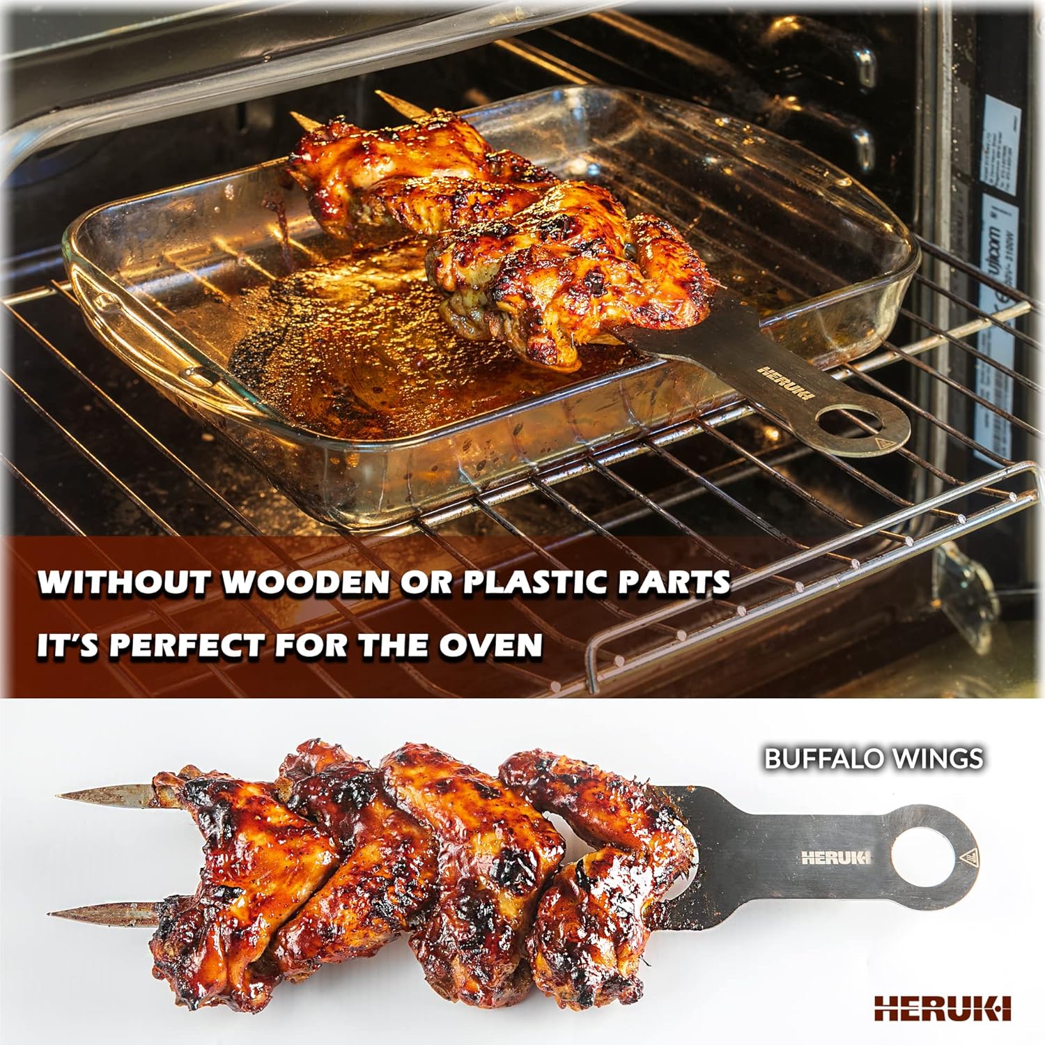 - DOUBLE METAL SKEWERS, 2.3” wide and 14.4” long for big pieces of meat, with a unique original design. You can serve with it in a festive meal at home or in restaurants