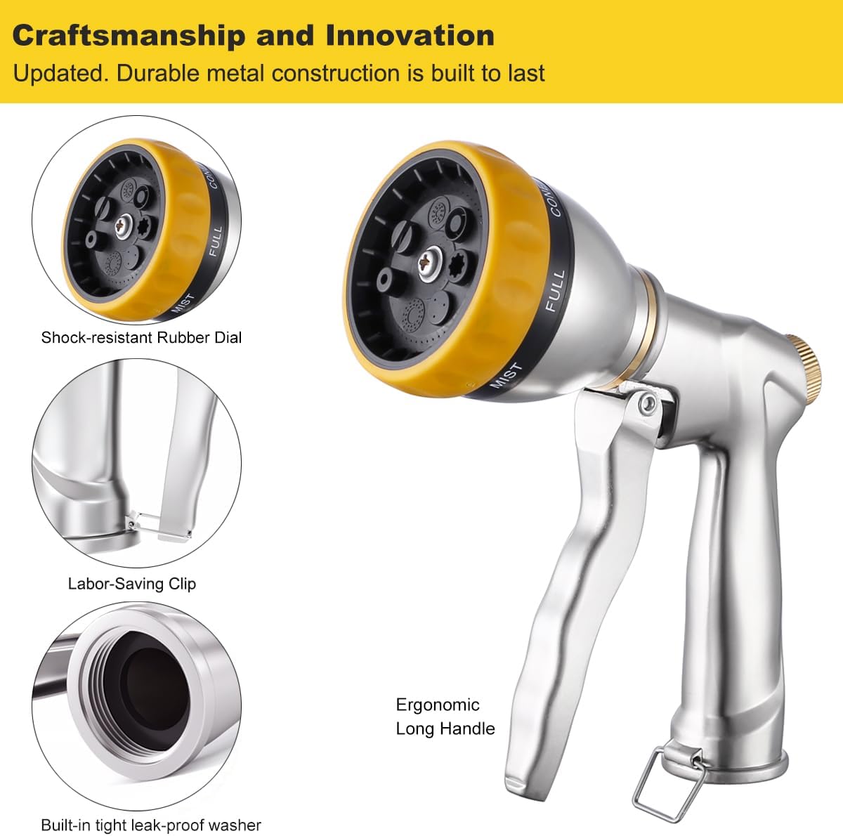 - UPGRADED HEAVY DUTY WATER HOSE NOZZLE: 100% Metal. FANHAO garden nozzle is extra heavy duty made of premium zinc alloy, high quality to prevent leak, rust, corrosion, and wear. The shock resistant rubberized bezel dial prevent it from accidental drops and damage. It is much stronger, more durable and long-lasting than plastic water nozzles.