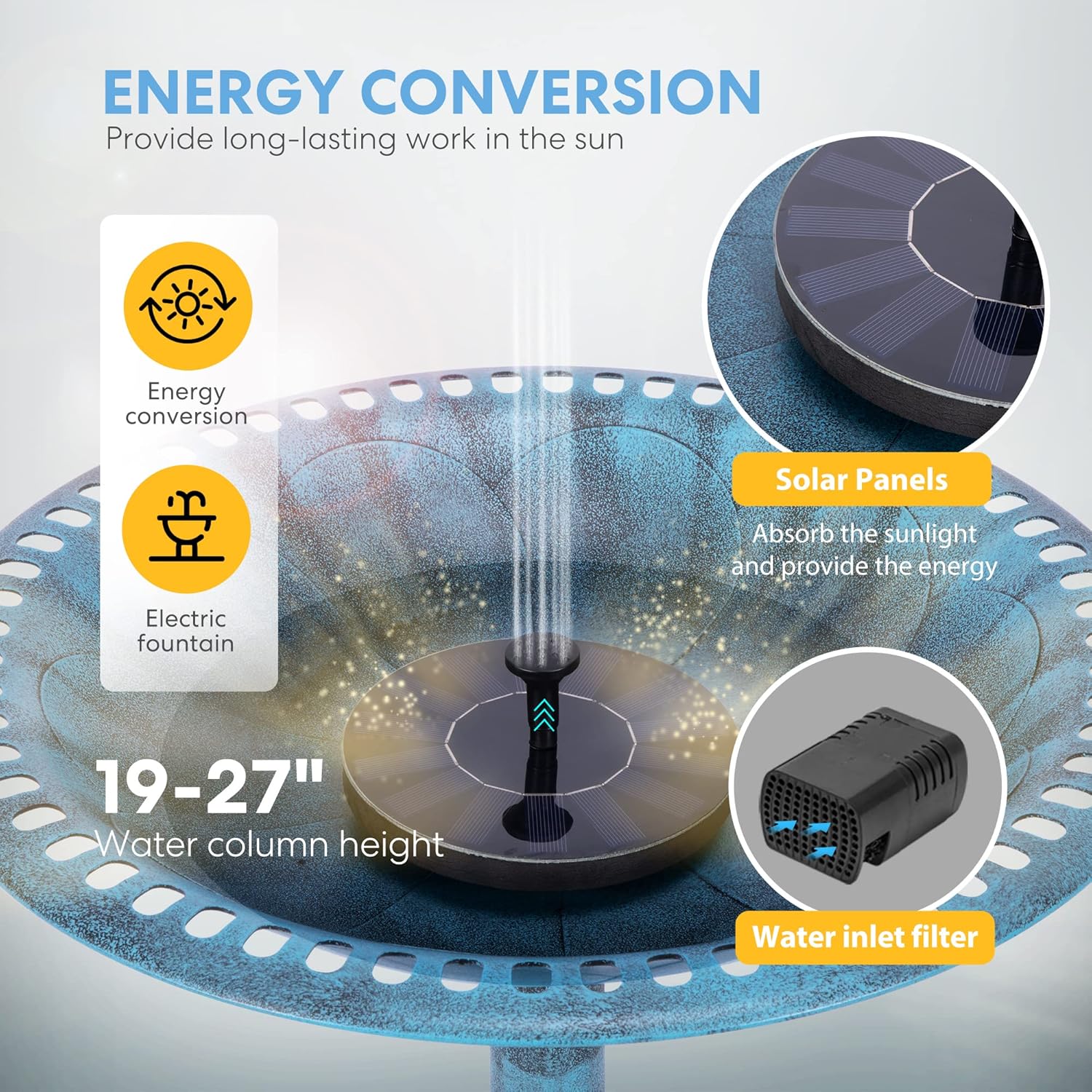 - SOLAR POWERED FOUNTAIN - The solar powered fountain takes energy directly from the sun and propel water into the air, not only convenient, but also energy-saving; Allows for multiple birds to drink or bathe at the same time