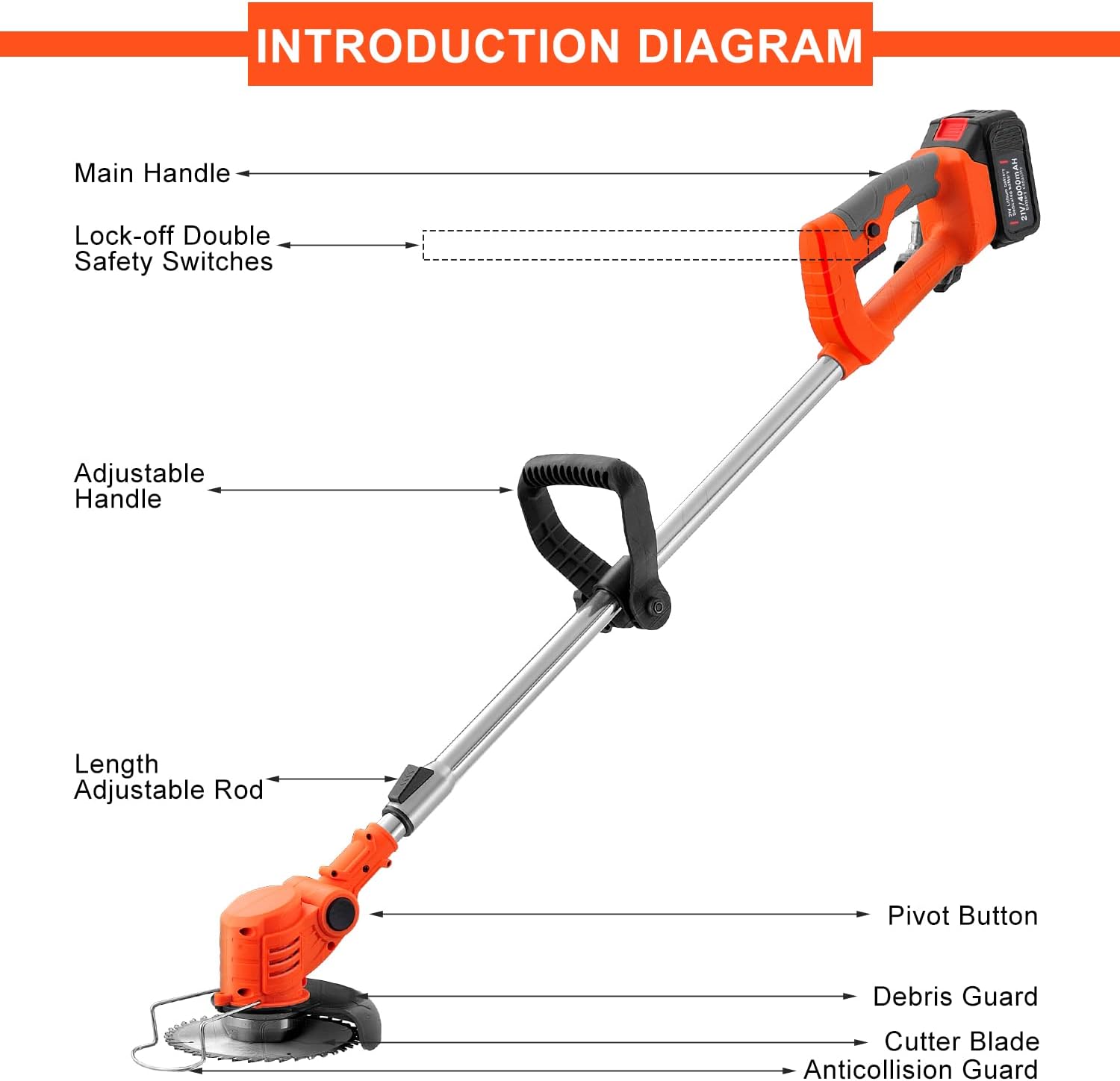 - 【Adjustable Cutting Head】-90 degrees adjustable grass trimmer can rotate into different positions, which helps you slope sections of the lawn and get into hard-to-reach corners with ease,Get going right away on yard work, lawn care, and other around the house projects.