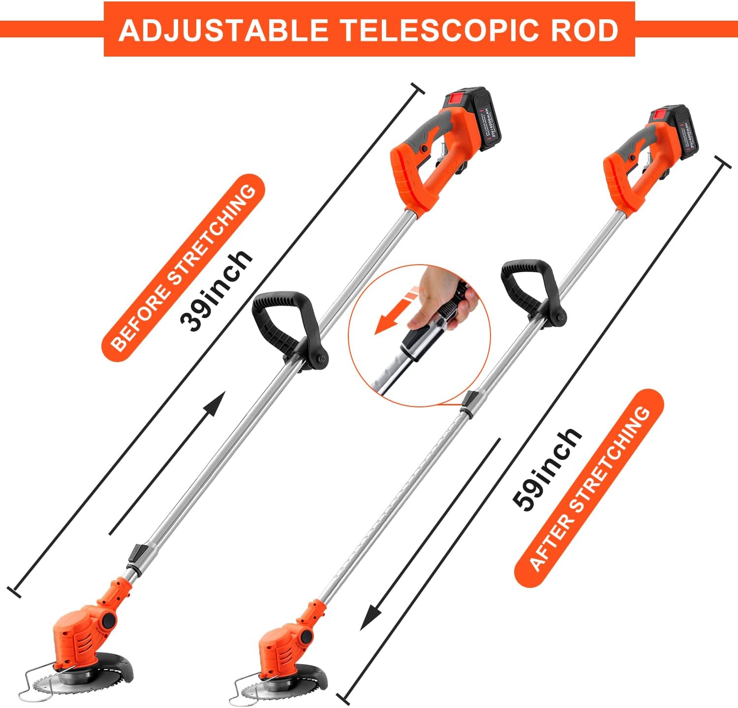- 【39-59 inch (100-150cm )Telescopic Alloy Shaft】- weed trimmer with an adjustable telescopic rod, makes it easier to trim under bushes and get to tough-to-reach places, you can freely change the operation height to your need, reducing lower back strain.