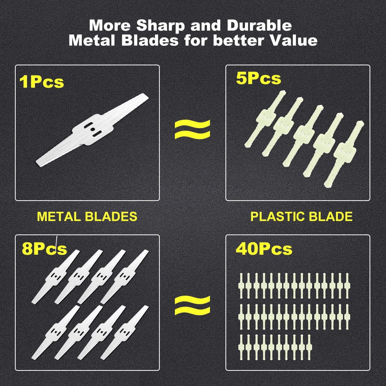 - 【Lightweight& Portable】-the weight of this Grass Trimmer is only 3 pounds,Not tired even use it all day,senior citizen and women can use it.Package Include 2*21V 4.0Ah battery, 1*Charger,2* saw blade,8 * steel cutting Blades, Metal blades are sharper and more durable than plastic blades and conventional string trimmer.