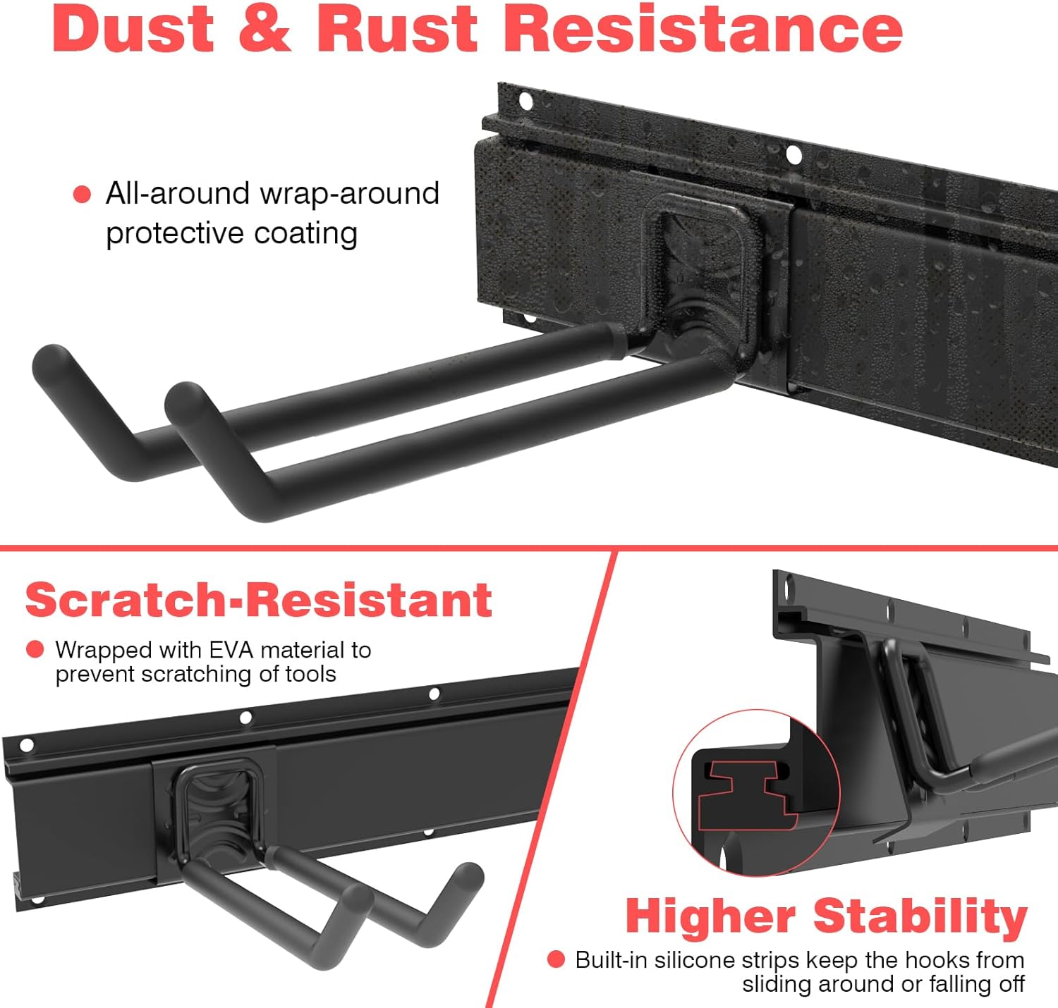 - Movable Garage Storage Hooks: When garage storage needs change, the fast wall-mount hooks can snap on the rail and move around on it to meet your actual needs. And It wonβt rust or chip over time