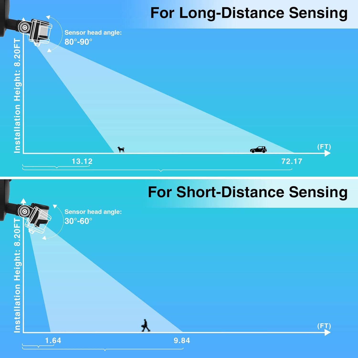 - Adjustable Sensing Mode: You can use the 3 knobs at the back of the sensor to adjust the detection distance, lighting duration and ambient brightness to activate the sensor. Setting the security light to work only at night or both day and night. 180ยฐ ultra-wide sensing range, 32.8ft sensing distance and 7~420S continuous illumination time provide you with a larger viewing area for an excellent nighttime experience. Tips: Not Solar Powered