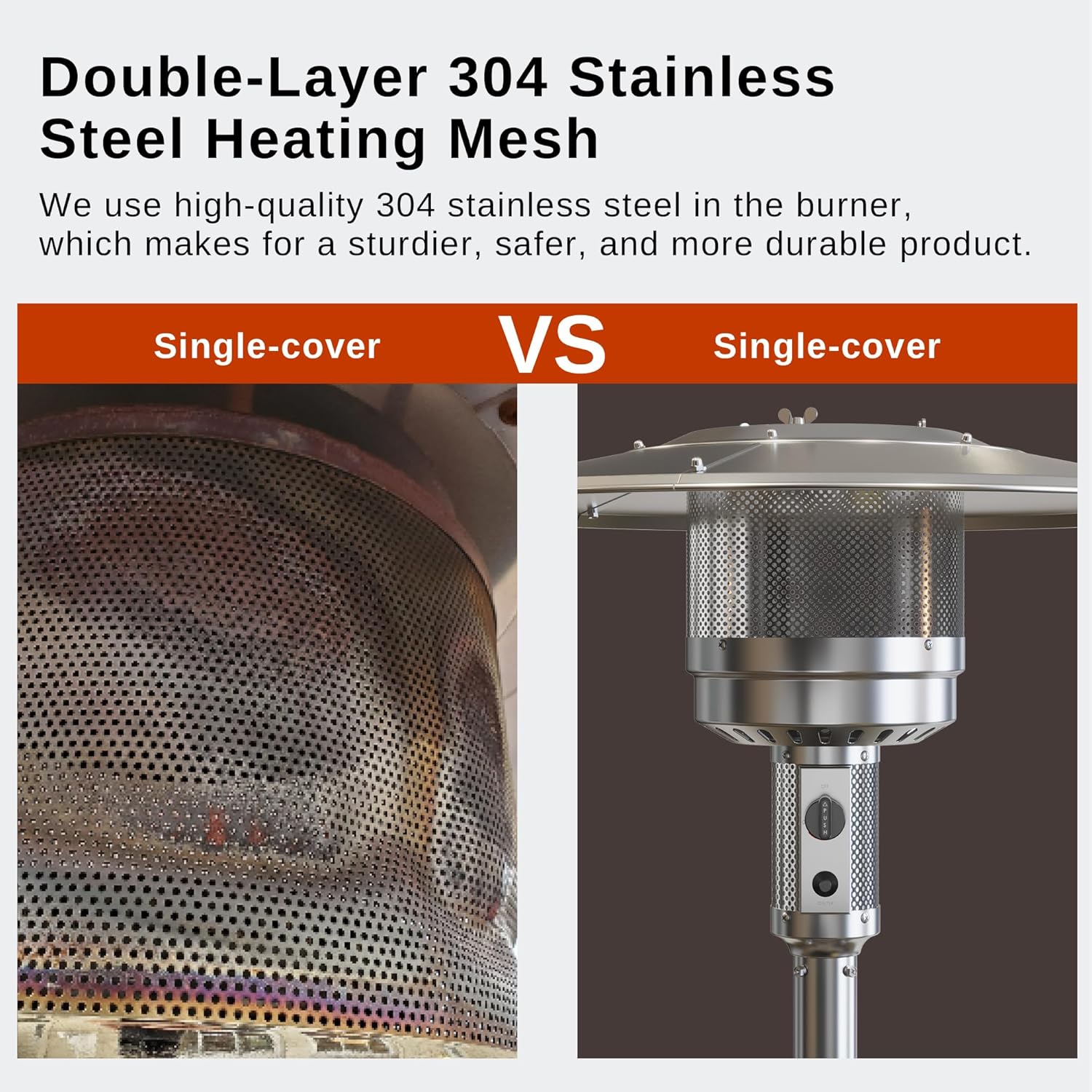 - šš¼ššÆš¹š²-šš®šš²šæ šÆš¬š° š¦šš®š¶š»š¹š²šš š¦šš²š²š¹ šššæš»š²šæ š š²ššµ - High quality 430 stainless steel burning grid is used in the design of the double cover heating grid. Compared with traditional single-layer burner mesh heaters, the East Oak Patio Heaters for outdoor use are stronger, more durable, and safer, and the upgraded model's service life can be increased by 30%