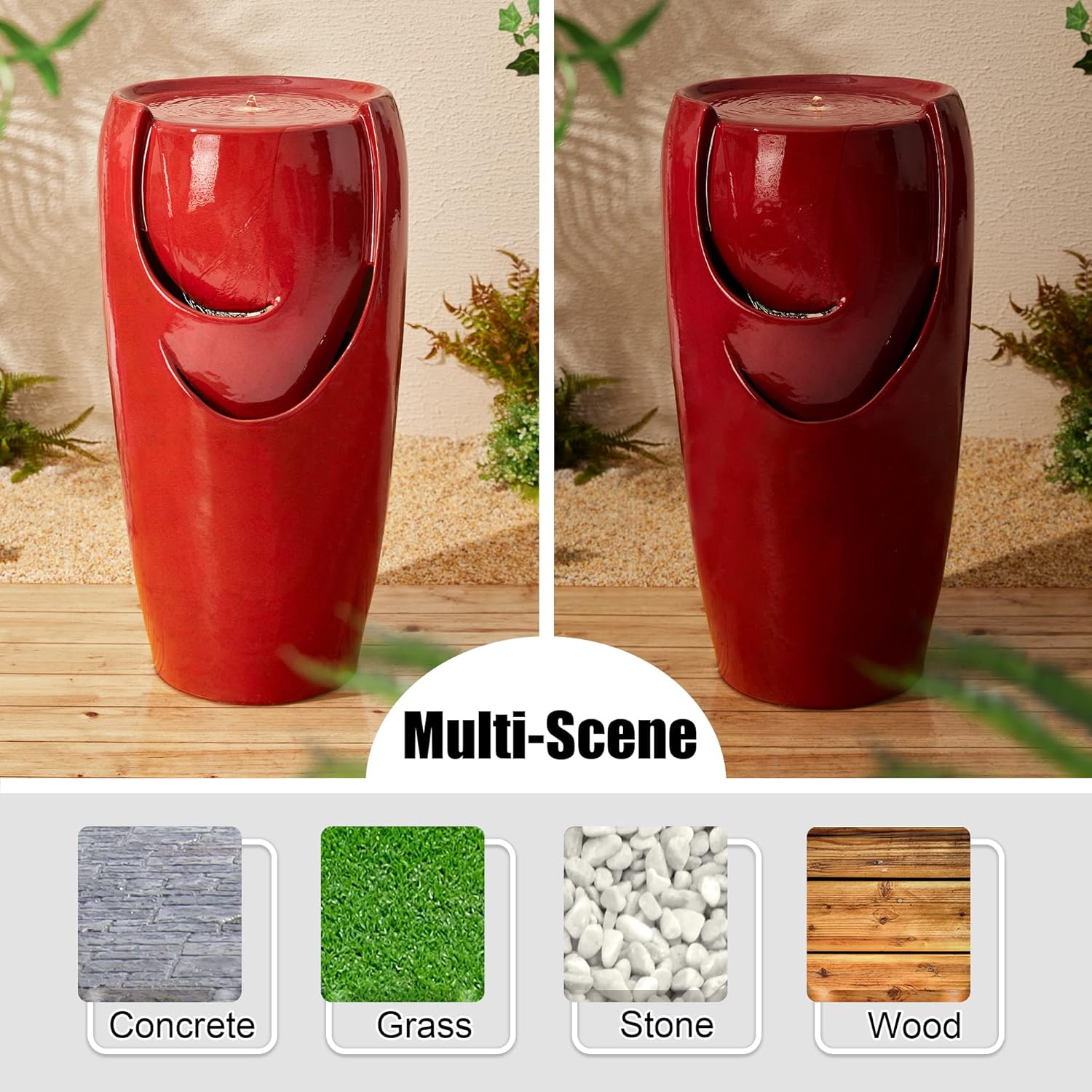 - Relaxing Water Sound: Rustic ceramic water fountain offers vintage yet modern accent. Features trickling water rippled and sparkled in the warm white LED light, elegant and charming kiln-fired red glaze finish. With a stylish antique look, the fountain brings a touch of natural beauty, the soft sound of cascading water is sure to make you relax and makes a soothing rest for you in the garden. The pump can be adjusted to prevent loud water sound