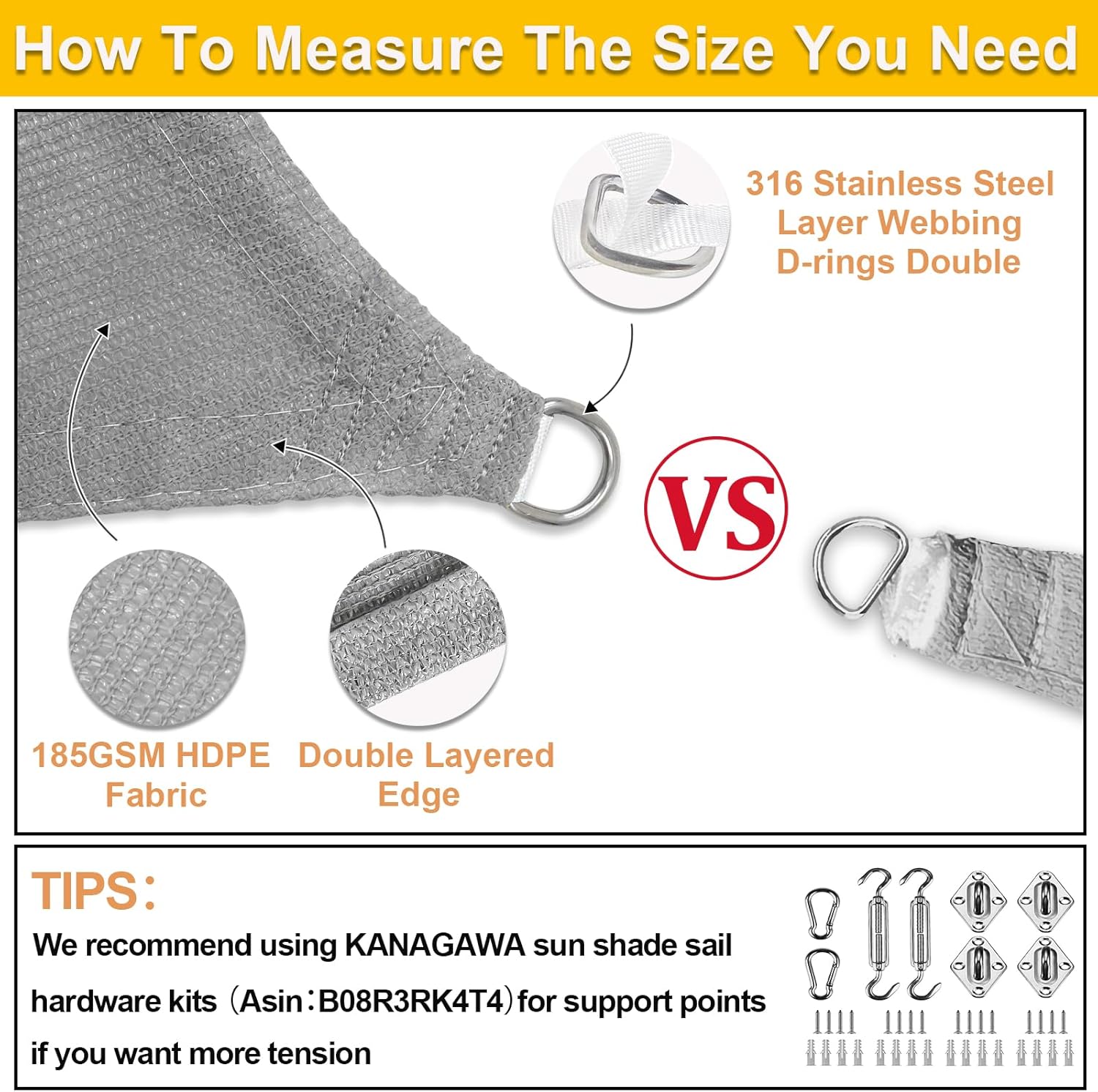 - High Quality Materials: Made of 100% brand new 185 GSM HDPE (high density polyethylene) material.Our sunshade sail is attached with DOUBLE layer webbing in each side and stainless steel D rings in corners to make the sun sail shades stronger and more durable