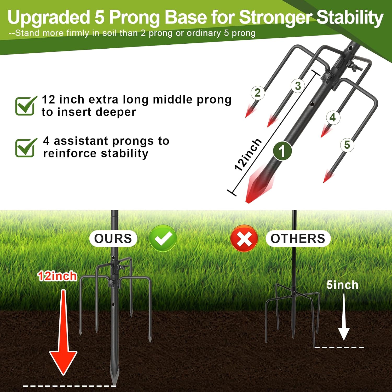 - Rock-Solid Stability, From Soft Soil to Hard Soil:Features a unique 5-prong base with an extra-long 12" center spike and 4 side prongs, this upgraded design keeps your hummingbird feeder pole stable - even in loose or sandy ground. No more tipping or wobbling in your outdoor garden,yard or flower beds.