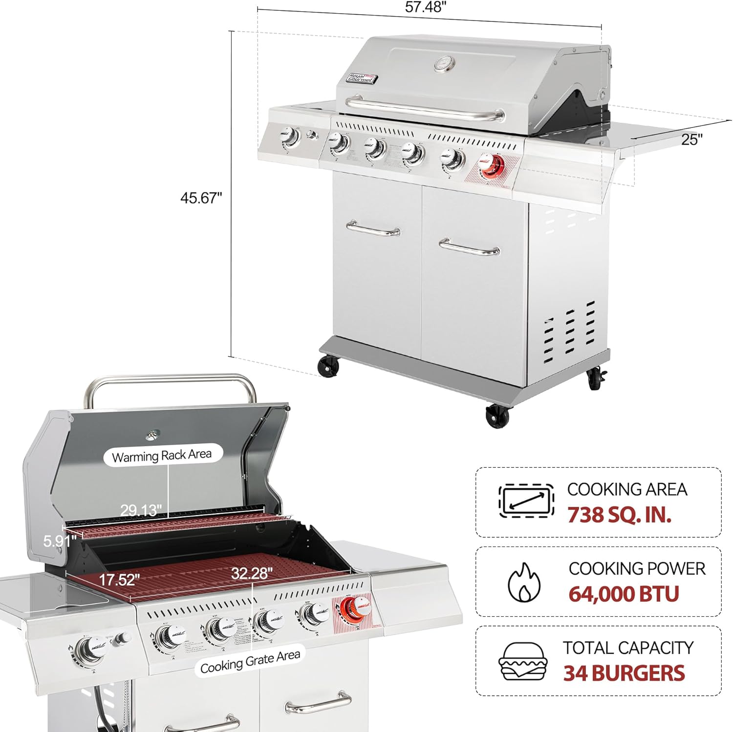 - Spacious Cooking & Prep Space: This 5 burner propane grill offers 738 sq. in. total cooking areaβ566 sq. in. porcelain-enameled cast iron grates and a 172 sq. in. warming rack, fitting 34 hamburgers. A right side shelf provides prep space for tools & seasonings; the side burner lid folds down for extra room when not in use