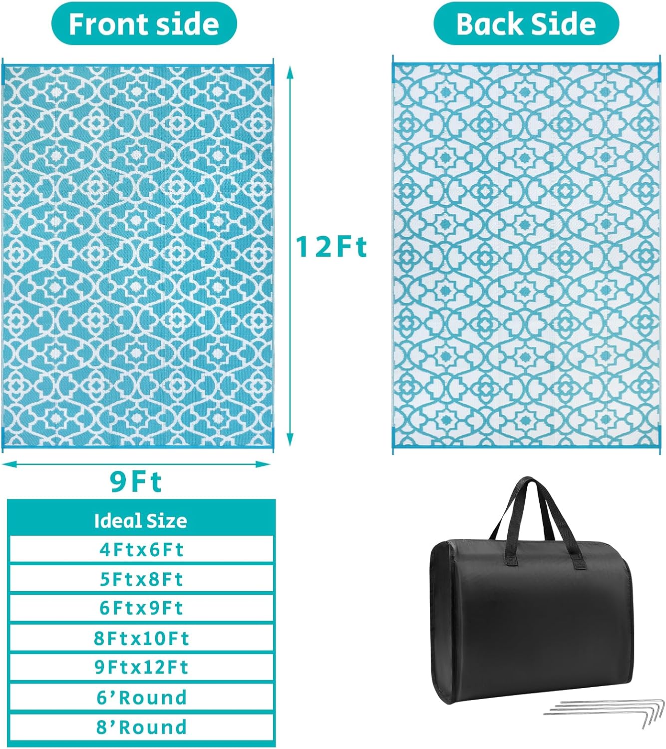 - Reversible Outdoor Rugs: Featuring a classic moroccan pattern on both sides, this rectangular 9x12 ft outdoor area rug allows you to instantly refresh your patio, porch, backyard, deck, RV campsite. And this outdoor deck rug is reversible, two-sided design allows you to have two different looks,both sides can blend perfectly with nature and look very full and comfortable.