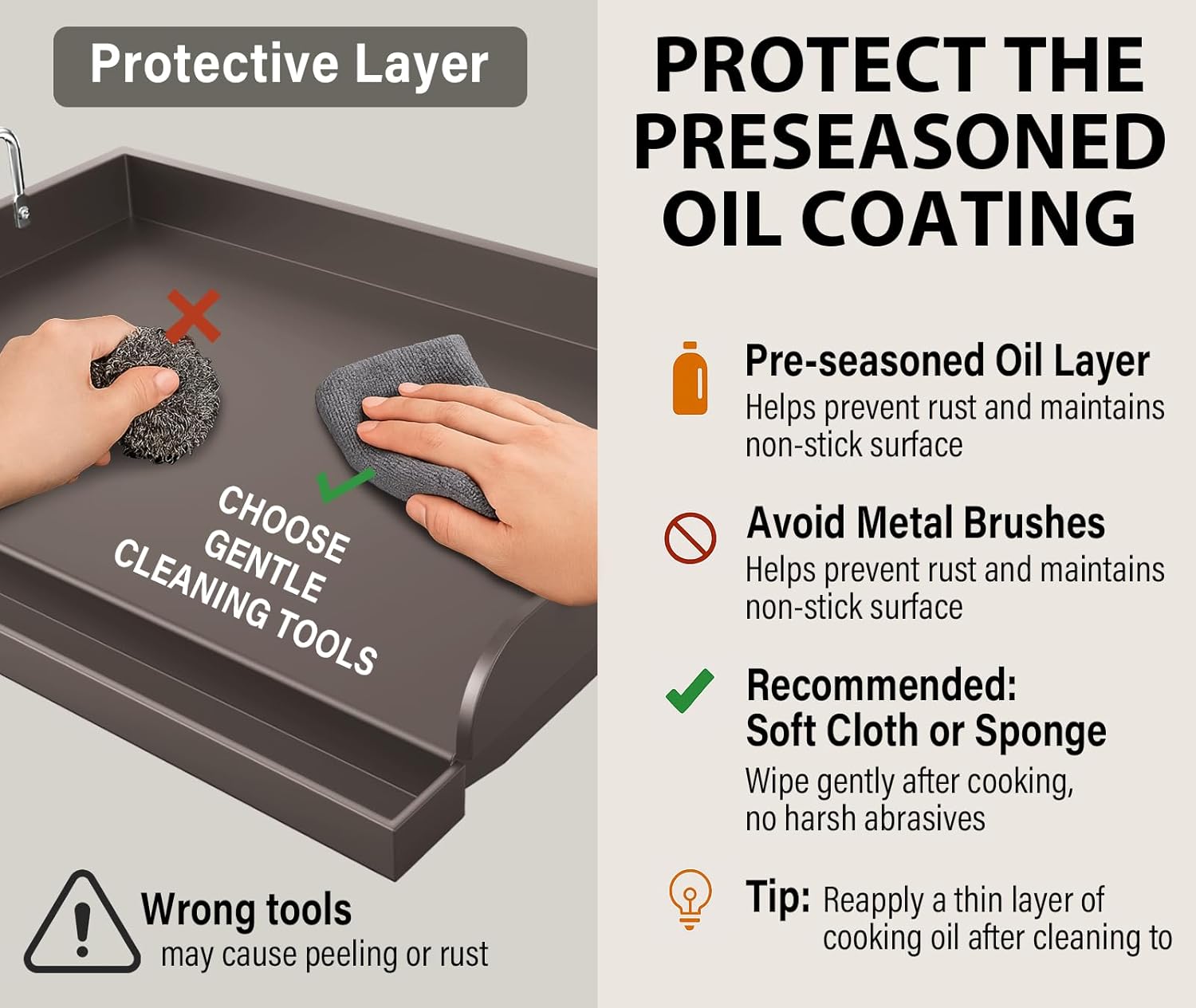 - 【Durable Metal with Protective Coating】 Crafted from heavy-duty metal, this griddle is built to resist warping and retain heat evenly. A protective oil coating is pre-applied to prevent rust—do not use metal brushes or abrasive tools to clean, as this may damage the coating. Use soft cloths or non-metal scrubbers for cleaning.