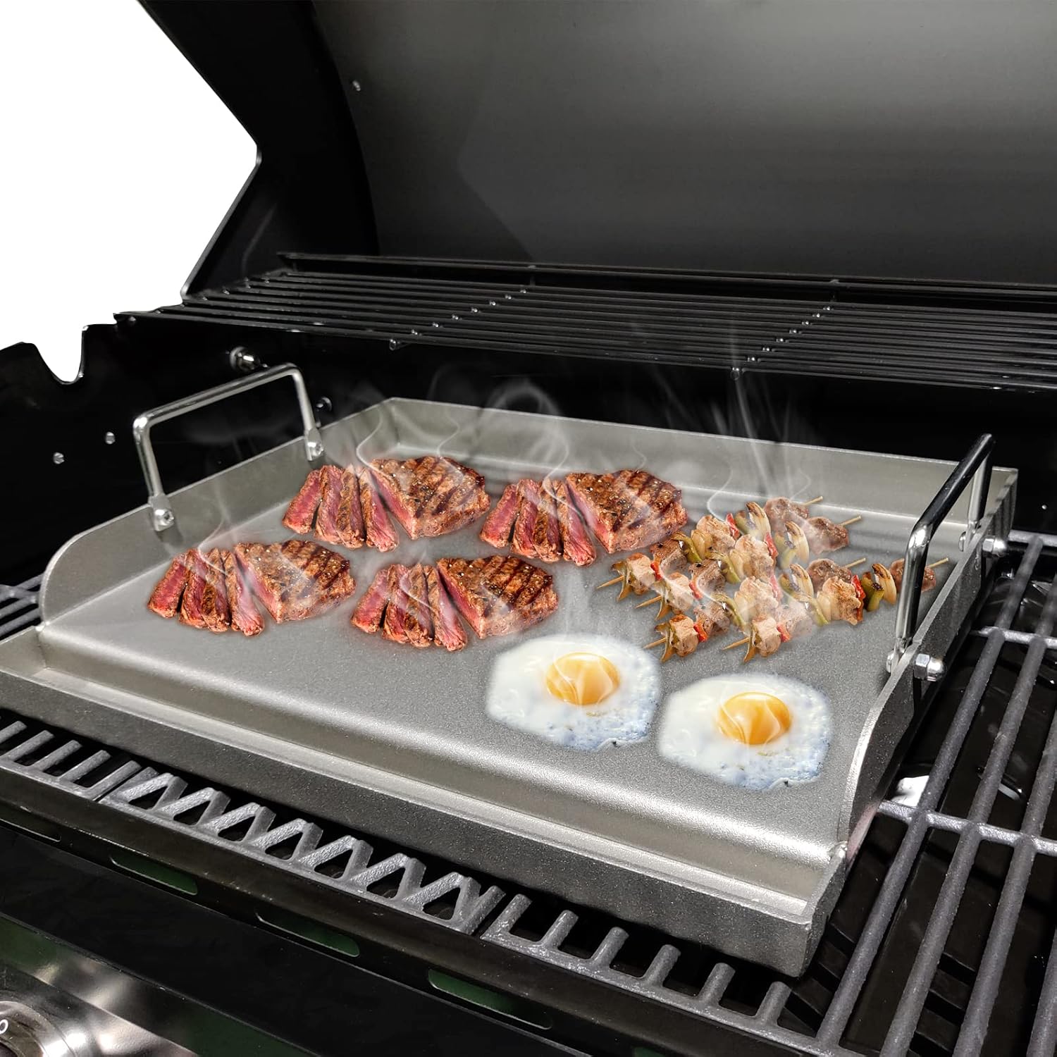 - griddle for gas grill【Ideal Choice】 ►Hollowing out of the side panels maintains ventilation and makes the air flow evenly, efficient heating ►Great for breakfast, lunch and dinner, also grill small foods well, like onions, mushrooms, shrimp and meat, including Teppanyaki style foods and more【Intimate Designs】►High bar sides prevent grease stains and food splashes, Sidewalls are ideal for flipping and turning, keep food on griddle ►Groove design to catch and dispose grease/oil